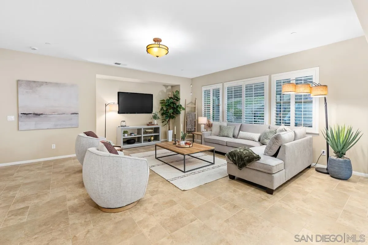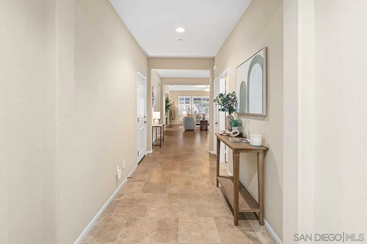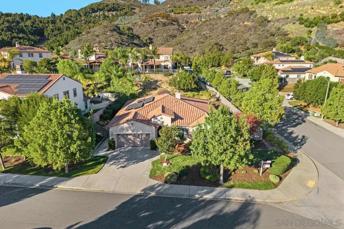 Beautiful SINGLE STORY home situated on a large corner lot on a quiet cul-de-sac. Tucked away in a peaceful setting and backed by scenic hills, this home offers serene mountain views and tranquil surroundings. Designed for entertaining, the open, flowing floor plan features a formal living room & dining room, a gourmet kitchen with a large center island, spacious breakfast bar, stainless steel appliances, and granite countertops. The elegant primary suite features dual walk-in closets and a spa-inspired bath with an oval soaking tub and separate shower. The secondary bedrooms are located on the opposite wing of the home for added privacy. Notable upgrades include a solar system for energy efficiency, new water heater, water filtration system, water softener system, central vacuum system, security system, plantation shutters, upgraded windows, and an epoxy-coated garage floor. The beautifully landscaped, low-maintenance backyard offers a charming water fountain feature and a covered patio—perfect for relaxing or hosting guests. Low HOA and No Mello-Roos! Chaparral Ridge delivers the ideal blend of country comfort and city convenience—just minutes from recreation, entertainment, shopping, and more. Outdoor enthusiasts will appreciate the close proximity to Dixon Lake and Daley Ranch.