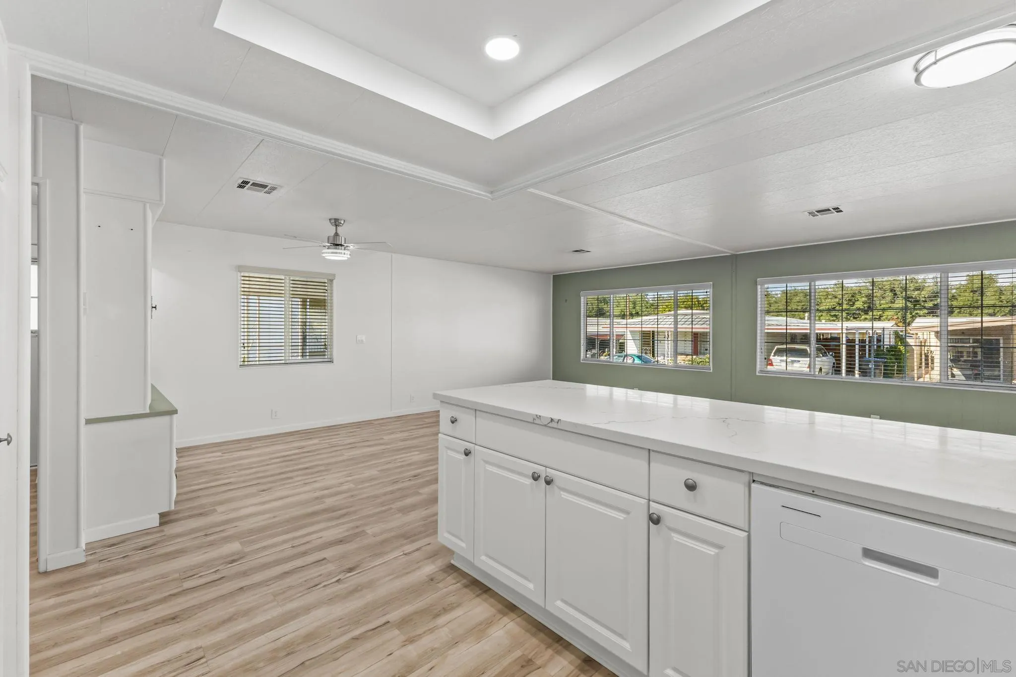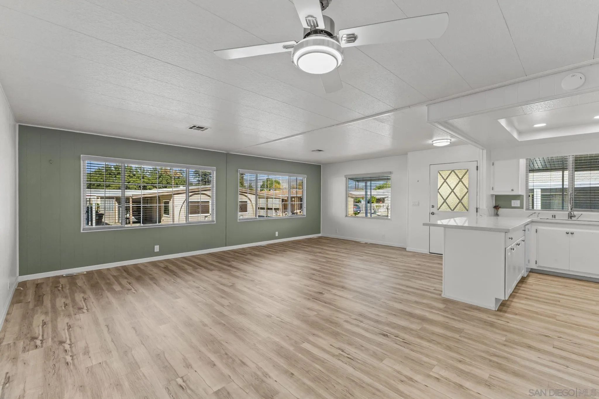 Welcome to this beautifully refreshed 2-bedroom, 2-bath manufactured home located in the highly desirable 55+ Colonial Country Club. Situated in a peaceful interior location, this spacious 1,344 sq. ft. home offers bright, open living areas and extensive recent updates that make it truly move-in ready. Step inside to an expansive great room featuring new flooring, fresh interior paint, and abundant natural light from oversized front windows. The updated kitchen includes quartz-style counters, a large peninsula with bar seating, recessed lighting, newer fixtures, and ample cabinetry. A built-in illuminated hutch adds additional storage and display space, perfect for entertaining and dining. Both bedrooms are generously sized and offer updated lighting and ceiling fans. The primary suite includes an upgraded bathroom with a modern vanity, spacious counter area, and walk-in shower. Outside, enjoy multiple private patio areas surrounded by mature landscaping, including citrus trees and flowering plants. The covered side patios offer ample shade and outdoor living space, ideal for relaxing or gardening. The home also features dual covered carports, low-maintenance landscaping, and easy access steps with railings. Colonial Country Club offers resort-style amenities, including an 18-hole golf course, putting green, heated pool and spa, fitness center, shuffleboard facility, clubhouse, library, and pet areas, all included in your monthly space rent. Conveniently located near shopping, restaurants, and highway access. A well-maintained, spacious home in a vibrant 55+ golf commun