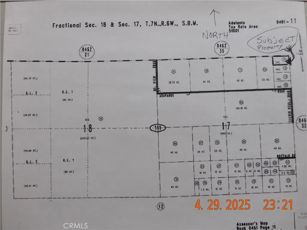 Five beautiful acres in Adelanto for less than for just $5,995! Located on what would be the natural extension of Trenton Rd, if Trenton Rd were extended to the west beyond Saddle Ave. Saddle Mountain Village is just NW of this property, Hwy 395 to the east. Shadow Mountain Rd is to the north of the property and also turns south and goes right to the property. Not sure which is the best route but below are 3 possible routes (based on satellite view). Probably best to take a 4 wheel drive vehicle & water. GPS Coordinates : Latitude 34.7032, Longitude -117.52. NOTE: Mileage/GPS/Directions are estimated. Route 1: This route probably has the best access. From Hwy 395, go west on Trenton Rd. 3.25 miles to Saddle Ave. Turn left and go 1/2 miles to Boots Ln. At Boots Ln, turn right and follow dirt rd (Resin RD) 1 mile. At this point you will see a dirt road heading north. Turn right and go 1/2 mile to the approximate location of the property, which will be on your right. Route 2: Most direct route but need 4 wheel drive to cross a wash. From Hwy 395 (or from Silver Lakes) take Shadow Mountain Rd west to Hwy 395. Cross over Hwy 395 and continue 3.5 miles on Shadow Mountain Rd, then keep left and make 90 degree turn to follow Shadow Mountain Rd south for another 1.4 miles. Road will fork, keep left, go another 165' you will be on the approximate west line of the property. This part of Shadow Mountain Rd appears to run right down the west boundary line of Subject property. Route 3: From Hwy 395 go west on Trenton Rd 3.25 Miles to Saddle Ave. Trenton Rd appears to end at this point. W
