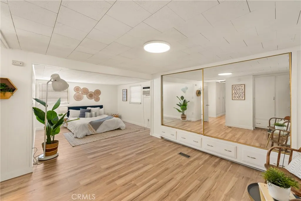 Charming Desert Home - in 55+ Palm Springs Community. Welcome to your desert retreat! This spacious 1-bedroom, 1-bathroom mobile home is ready to move in! Offering 945 sq.ft. which includes the 225 sq.ft. elegant enclosed sunroom. Remodeled throughout, with modern features including new flooring, fresh paint, new fixtures, new trim, and modern lighting throughout. The oversized bedroom offers plenty of space and flexibility to create a second bedroom if desired, or enjoy it as a spacious reading room, office, or mini-gym, the possibilities are endless! The open floor plan seamlessly connects the living room and kitchen, creating an inviting space for entertaining. The kitchen and bathroom feature beautifully refinished Spanish Saltillo tile flooring, adding warmth and charm to the space. The large bedroom provides plenty of closet space, while the bathroom has been refreshed for comfort and style. There is an abundance of closet and cabinet space throughout, including the well-appointed kitchen offering plenty of room for storage and organization. The home features all-new window treatments, including blinds, sheers, and blackout curtains. Covered porch/sitting area plus an additional side patioperfect for morning coffee, evening refreshments or relaxing outdoors. Covered carport and storage shed add extra convenience and functionality. Enjoy the convenience of in-home washer and dryer hook-ups, giving you extra flexibility. The pre-owned washer & dryer are complimentary (as-is). The park offers great amenities, including a sparkling swimming pool and relaxing hot tub, rec