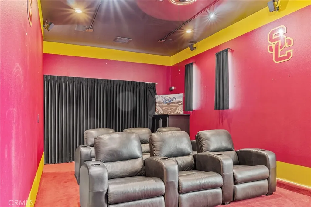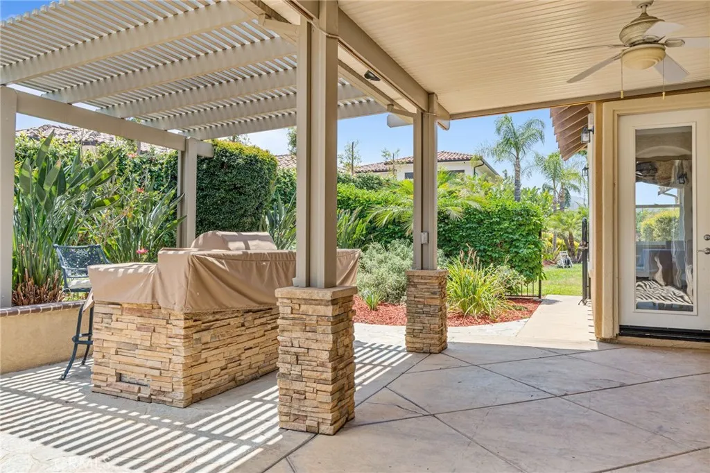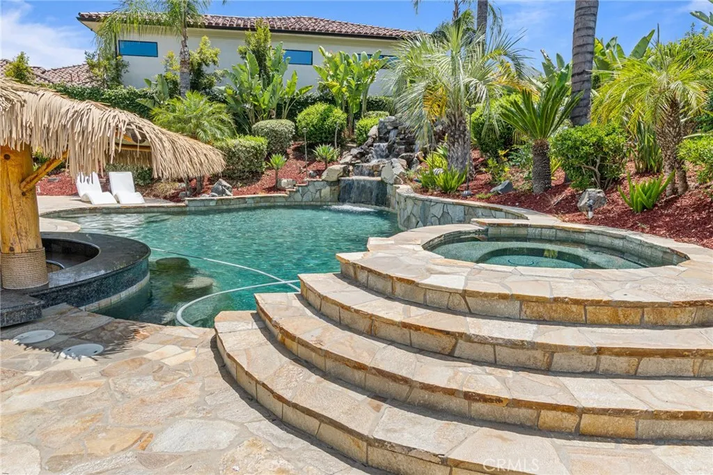 Cleveland Way in South Coronas single-story offers formerly model home, this maintained property boasts golf courses. The home primary suite with a spa-like bath, double-sided fireplace, and private retreat opening to the patio. All bedrooms furnished with ceiling fans. Kitchen featuring Sub-Zero refrigeration, double ovens, and polished travertine floors. Theater room. Guest suite with private entrance. 24 owned solar panels for energy efficiency. The Ultimate Backyard Escape: Step into your own paradise, designed for entertaining and relaxation: Sparkling pebble-tech salt water pool with a swim-up bar: Handcrafted palapa with thatch roof, built-in BBQ, and premium outdoor kitchen: Raised hot tub, cascading waterfall, and stone firepit: lounge decking surrounded by tropical greenery: RV-friendly side yard (potential for covered parking), also equipped with whole house water softener and alarm system. Prime Corona Living. Walkable greenbelt trails leading to scenic parks. Minutes from The Crossings, Dos Lagos Shopping, and top golf courses (Eagle Glen, Hidden Valley & more) Highly acclaimed schools in a sought-after neighborhood.