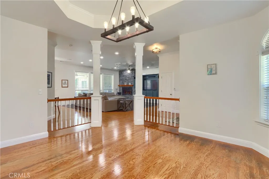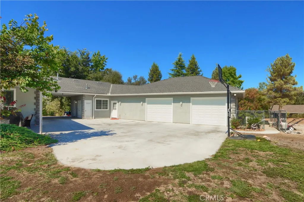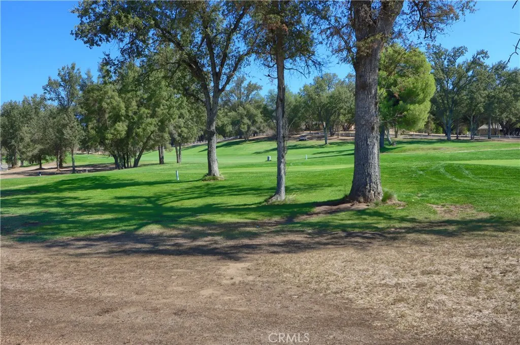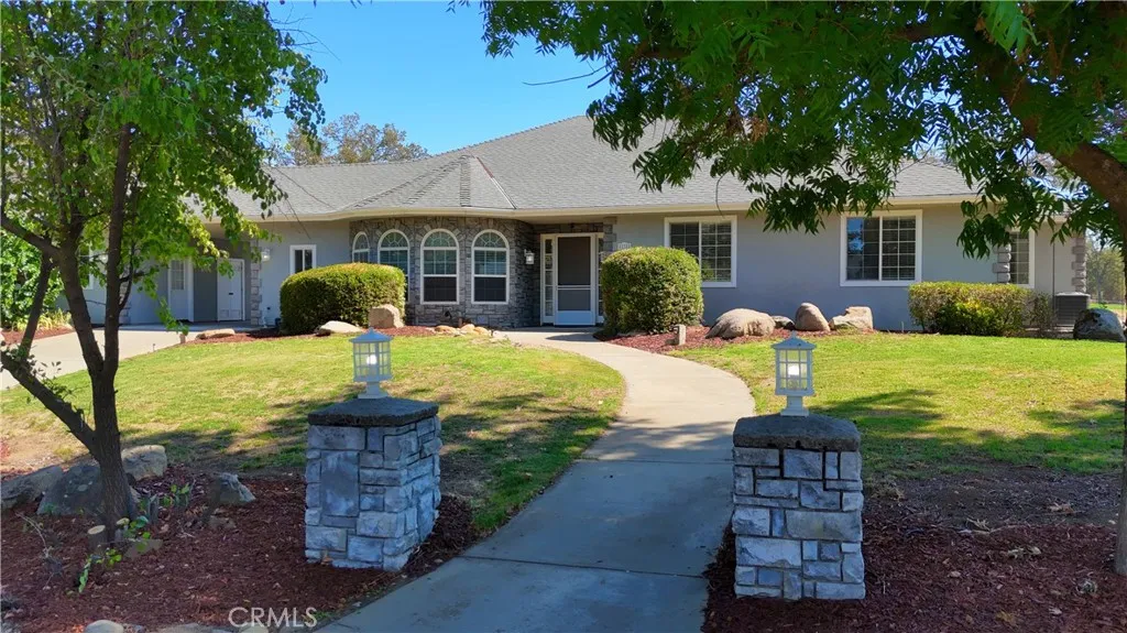 On the 6th fairway in River Creek Golf Course, this custom 5-bed/4-bath, 3,050 sq. ft. home on 1.02 acres includes a separate bonus room with full bath and its own split HVAC, plus a unique drive-through breezeway separating the bonus room, garage from the main residence. A spacious great room, with coffered ceilings, centers around a raised-hearth wood-burning fireplace, while the primary suite features a custom built-in propane fireplace. The upgraded kitchen offers granite countertops, new paint, propane cooktop, double ovens, and a trash compactor, with a casual breakfast nook and a formal dining room nearby complete with a San Miguel Mission-style columns. Throughout are carpet, tile, laminate wood, and stained concrete floors with custom baseboards and crown molding, panel and custom doors. Practical comforts include two standard water heaters (one at each end of the home), two separate HVAC systems, a centrally located laundry room near the bedrooms, RV parking, underground utilities, gutters, sprinklers for the landscaped yard, and a generator hookup. Located in beautiful Ahwahnee River Creek Estates,near downtown Oakhurst with quick access to Bass Lake and Yosemite National Park.