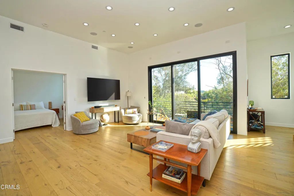 Nestled at the end of a quiet and serene cul-de-sac, just moments from Pasadena and with convenient access to Los Angeles' major arteries, this newly constructed, three-story home exemplifies luxurious living. With chic contemporary design, natural lighting, and stunning city views, it offers a rare opportunity to enjoy a modern lifestyle in a highly desirable location. Step into an open-concept living space perfect for entertaining. Blonde Oak hardwood floors flow throughout, complemented by recessed lighting and expansive LaCantina 3 panel sliding glass windows that frame breathtaking views. The state-of-the-art kitchen features sleek Calacatta porcelain countertops, a bookmatched Calacatta porcelain backsplash, brand-new stainless steel Thor appliances, a wine fridge, and an island with ample space for dining and meal preparation. Adjacent to the kitchen is a versatile bedroom with a full bathroom, ideal for use as an office, gym, or guest room. A convenient half bath is also located on this level. The second floor hosts the luxurious primary suite, complete with a walk-in closet, large LaCantina 3 panel sliding glass windows, and a private indoor-outdoor terrace. The spa-like primary bathroom includes a soaking tub for ultimate relaxation and a walk-in shower with bookmatched porcelain slabs. A secondary bedroom with its own full bathroom and a dedicated laundry area complete this floor. The top level boasts a shaded patio, perfect for dining and entertaining. A short staircase leads to the rooftop deck, offering panoramic views of Los Angeles and the Downtown LA Skylin