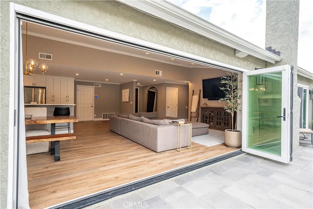 TAKE ONE LOOK AT THAT YARD, AND YOU WILL DO WHAT EVERYONE DOES. YOU WILL ASK YOURSELF, 'WHY"? You will believe they spent about $200,000 on their backyard paradise consisting of artificial turf, a stack stone wall, the concrete pavers, the luxurious pool with 3 waterfalls, the 10'X10" spa, the SMOKER and separate bar-b-q ($8.6K), the free standing outdoor fireplace with flatscreen TV and the outdoor refrigerator. What helps make this home so special is the easy access to this fantasy rear yard through the Win-Dor Bi-Folding Doors ($21K installed) that make up nearly the entire LR and DR walls facing the rear yard. Look at the photos and accompanying 3D Matterport Virtual Tour which are neither a trick nor an illusion. That wall just kind of disappears. Talk about "Open Concept!" To answer the question, "We thought this was going to be our forever home and we wanted it to be special and perfect." They may have spent more on the inside of the house than on the outside. As with many homes on the market, this single story charmer also has raised panel doors, Shaker Style soft close cabinets/drawers with dovetail joint construction, textured ceilings, vinyl windows/sliders, door/window casings, crown molding, oversized baseboards, wide-blade Plantation Shutters, Decor plugs/switches, recessed lighting, a pulldown attic ladder in the garage, a 2 year old HVAC system, remodeled kitchen/baths and Luxury Vinyl Flooring. This home is in a highly desired neighborhood in the heart of Mission Viejo, near schools/shopping, with easy access to transportation AND has a panoramic view overl