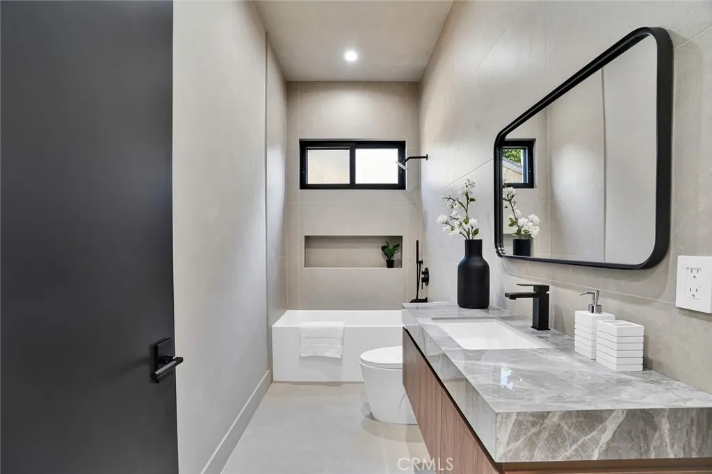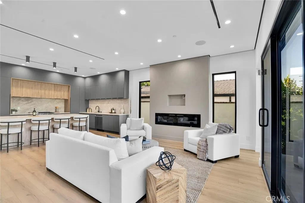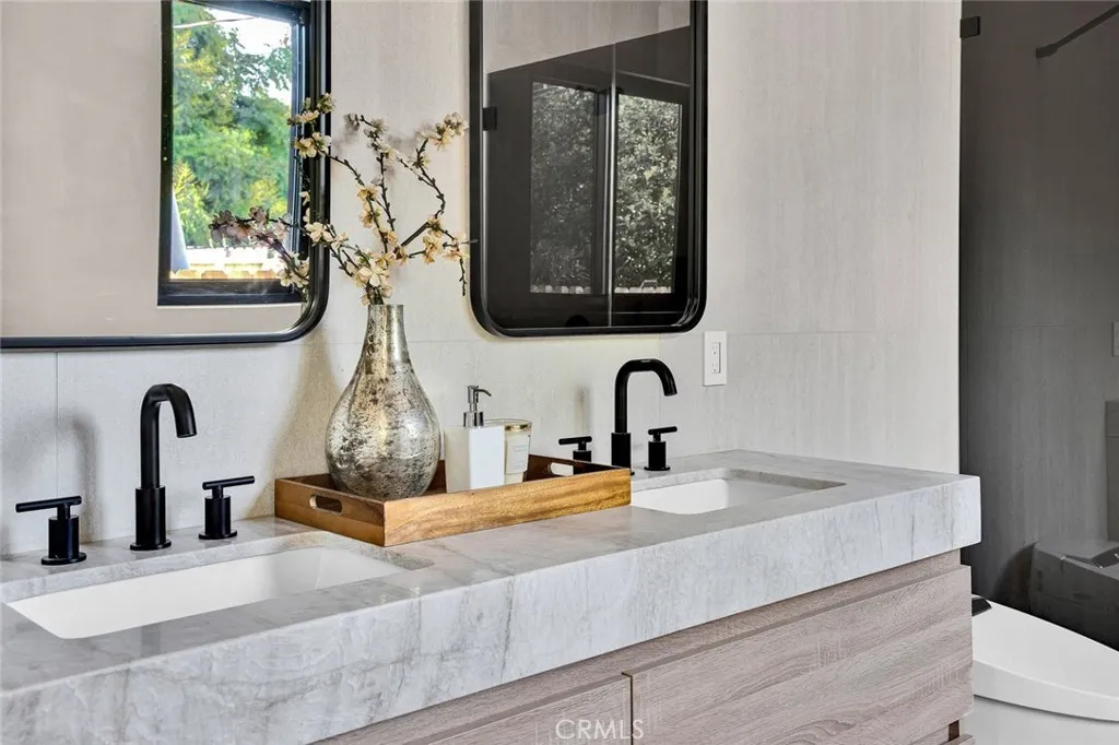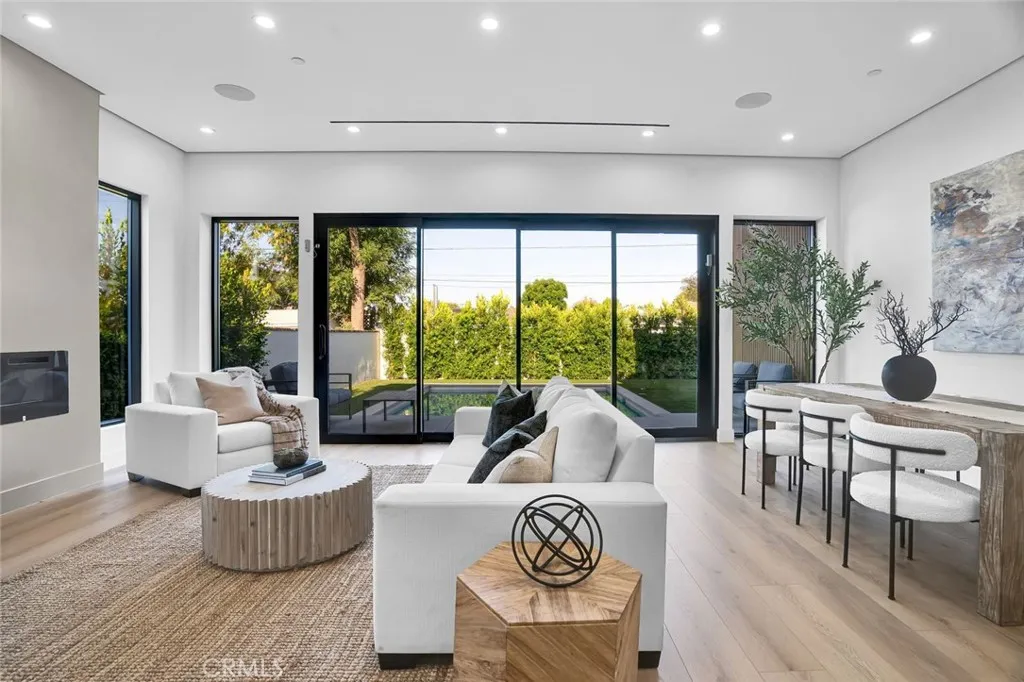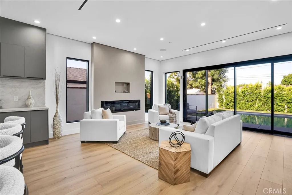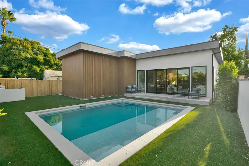 Come see this beautifully almost brand new- 3-bedroom, 3.5-bathroom pool home in Encino, offering 2,107 sq. ft. of stylish living space. The impressive 12-foot-high entry ceiling and pivot front door create a grand first impression, while high ceilings of 10 feet, throughout the house, make the home feel open and spacious. The layout includes a generous junior suite and a large primary master bedroom with a stunning walk-in closet and fireplace. The brand-new chefs kitchen has plenty of cabinets, brand new appliances and features Taj Mahal natural stone countertops and backsplash, opening to the dining and family room for effortless entertaining. Recessed lighting throughout the house, family room has a modern fireplace. Large sliding doors flood the space with natural light and connect you to the backyard retreat. Outside, enjoy the sparkling Baja-style pool with mini pebble plaster finish, surrounded by drought-resistant landscaping and synthetic grass for year-round beauty and low maintenance. This modern home has been thoughtfully upgraded with new heating and air conditioning, updated electrical and plumbing, and built-in sound speakers in the living area. This beautiful home has a laundry room with ample cabinets. There is a solar panel system. Located close to shops, parks, and quick access to the 101 Freeway, this home blends convenience with luxurious California living.