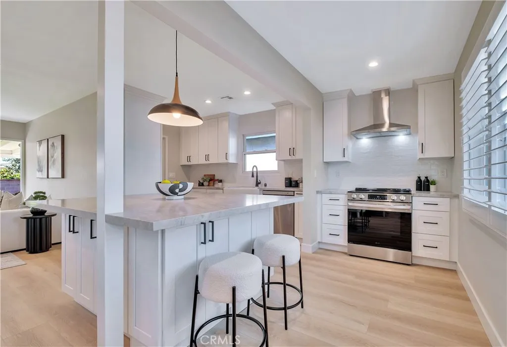 Beautifully Remodeled Anaheim Home. Welcome to this stunning, fully remodeled single-family home in the heart of Anaheim. Offering 4 bedrooms and 2.5 bathrooms, this home perfectly blends modern design with comfort and functionality. Step inside to find an open-concept floor plan where the main living area is filled with natural light and features large windows that create a bright, inviting atmosphere. The home showcases new white oak laminate flooring, recessed lighting throughout, and a seamless flow for everyday living or entertaining. The kitchen is a true showpiece with Taj Mahal quartz countertops, a large island, and custom cabinetry. The spacious primary suite boasts custom built-in closet cabinetry and a luxurious en-suite bathroom with elegant finishes. Every detail has been thoughtfully updated from the new roof to upgraded plumbing and electrical systems ensuring peace of mind and modern comfort. Enjoy Southern California living outdoors with a large grassy yard, large covered patio, and two-car garage. Conveniently located near parks, schools, and shopping, this light-filled Anaheim gem is move-in ready.