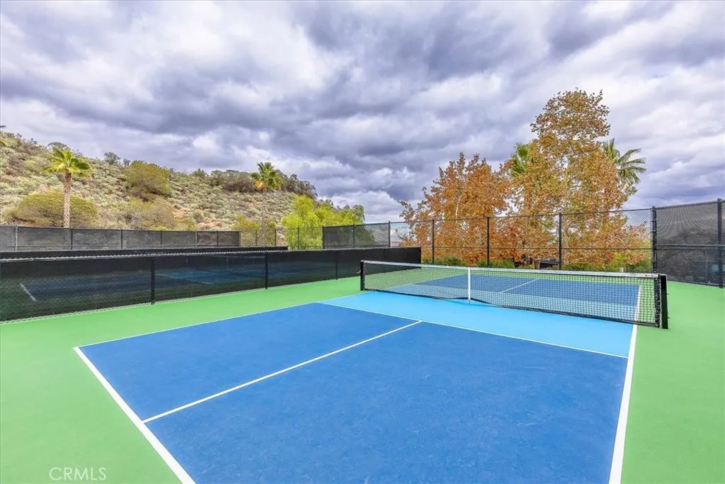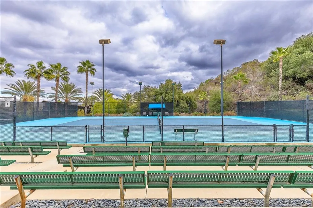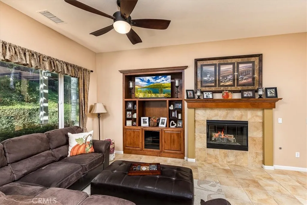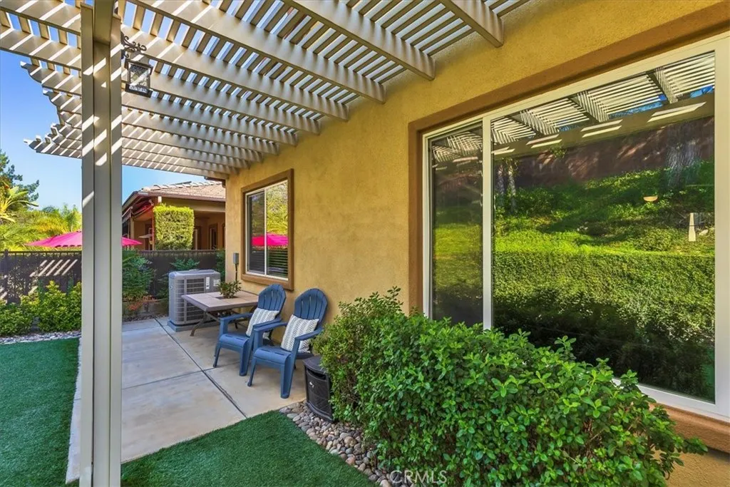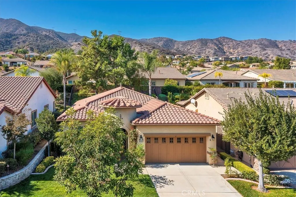 Welcome to 23931 Augusta Drive, a beautifully maintained single-story home (Inaja Model) located in the highly desirable 55+ gated community of Trilogy at Glen Ivy. This peaceful retreat offers resort-style living surrounded by the natural beauty of the Cleveland National Forest and the lush fairways of Glen Ivy Golf Course. A gated front courtyard welcomes you into an open and inviting floorplan. The spacious kitchen overlooks the family room and features granite countertops, a large island, pantry storage, gas cooking, and a new dishwasher. The family room is warm and comfortable with a gas fireplace, perfect for relaxing or entertaining. A flexible bonus room off the entry can be used as an office, den, or formal dining area. Tile flooring runs through most of the home, and ceiling fans in the family room and bedrooms add to the comfort. The primary bedroom is generously sized with a walk-in closet, walk-in shower, and linen storage. The guest bedroom is privately positioned at the front of the home, and the guest bathroom includes a shower over tub. Step outside to the back patio and enjoy a low-maintenance outdoor space with an Alumawood patio cover, turf lawn, and mature plants on drip irrigationideal for quiet mornings or entertaining friends. The HOA maintains the front yard, so you can truly enjoy a lock-and-leave lifestyle. Additional upgrades include a newer HVAC system with a quiet outdoor condenser, ADT security system with cameras, built-in garage cabinets, overhead storage racks, newer garage door opener, pet door to the side yard, and an updated water heater