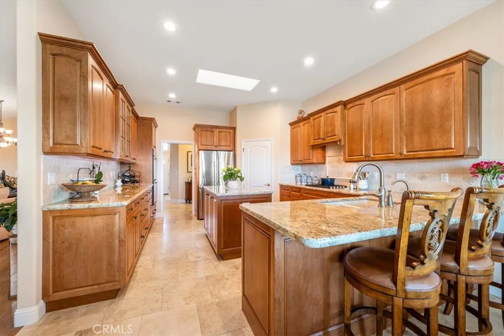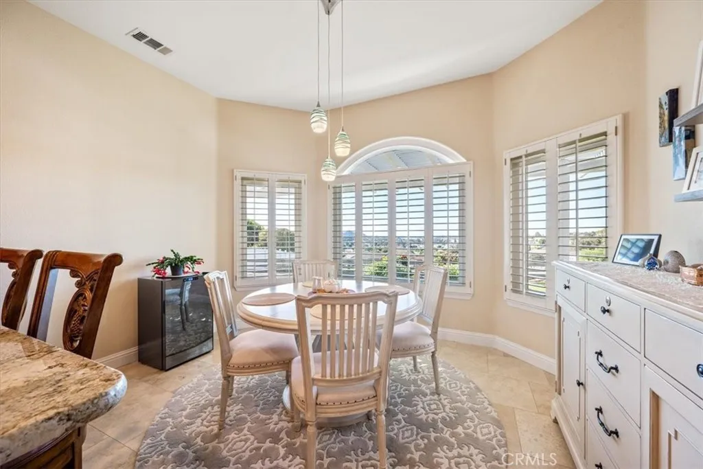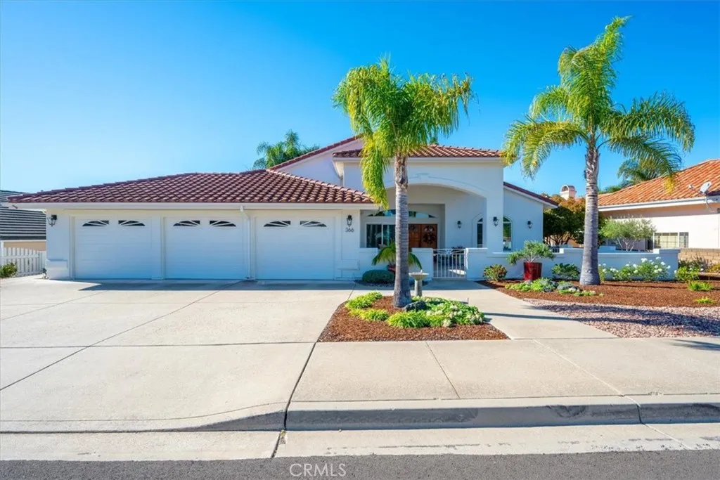 Immaculate single-level, three-bedroom, two-and-a-half-bath Mediterranean-style home located in the desirable Stagecoach neighborhood near the village of Arroyo Grande. Offering 2,660 square feet of thoughtfully designed living space, this property combines quality craftsmanship with relaxed Central Coast living. The remodeled kitchen features high-end appliances, hardwood cabinets, granite countertops, travertine and handmade tile backsplashes. A spacious pantry provides ample storage, while the peninsula bar opens to a welcoming breakfast nook framed by bay windows. The adjoining living and dining rooms include French oak flooring, cathedral ceilings, and a thermostatic gas fireplace that adds warmth and character. Milgard dual-pane windows and French doors fill the space with natural light and lead to a lattice-covered patio with views of the hills, dunes, and ocean beyondan inviting setting for entertaining or quiet evenings outdoors. The primary suite includes a remodeled bath with marble counters and Kohler fixtures, while the home office and additional bedrooms offer flexibility for guests or creative pursuits. A separate laundry room adds convenience, and a spacious three-car garage provides abundant parking and storage. Additionally, the home features a welcoming front courtyard, low-maintenance landscaping, air conditioning, and skylights that enhance comfort and efficiency. Every detail reflects care and quality, creating a home that is both beautiful and meticulously maintained. Located within the Lucia Mar School District, including Branch Elementary, Paulding