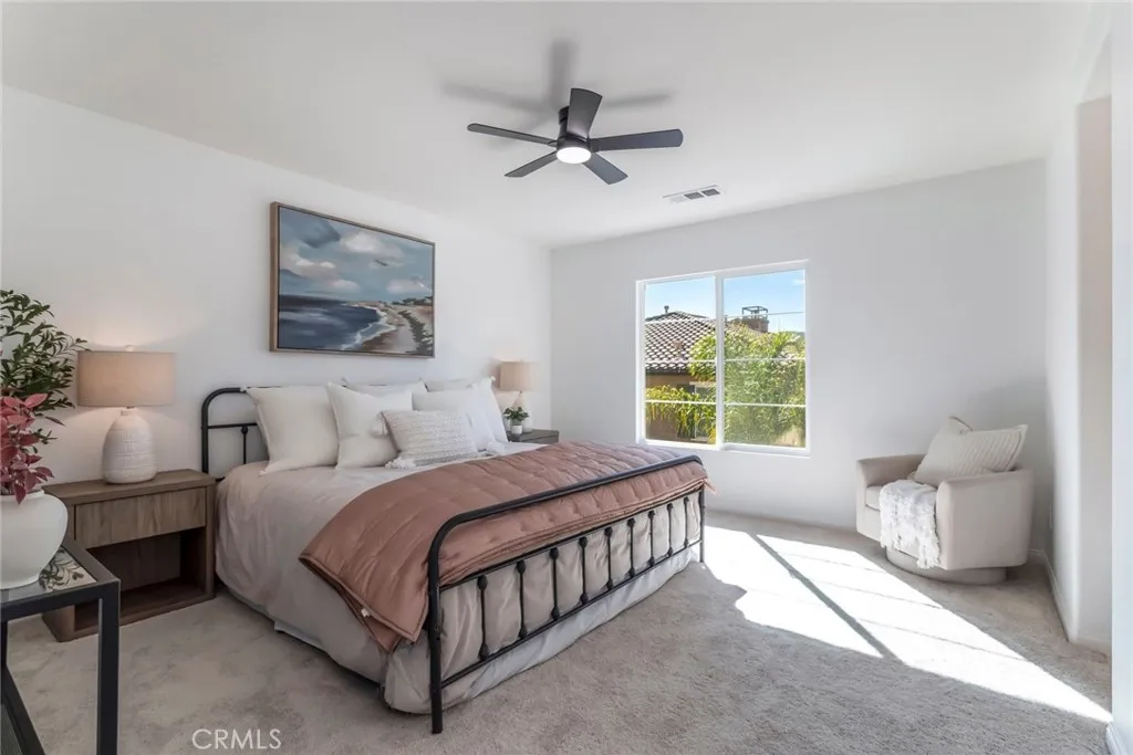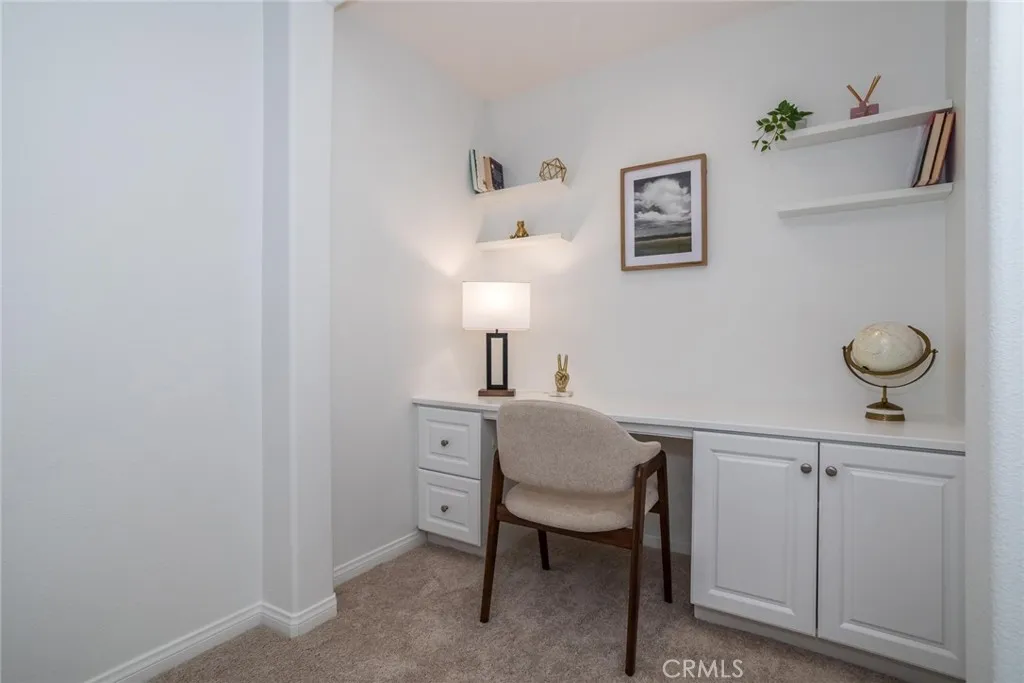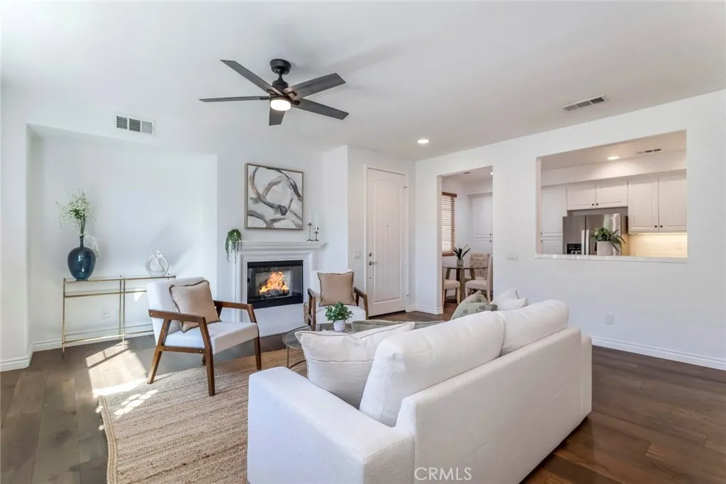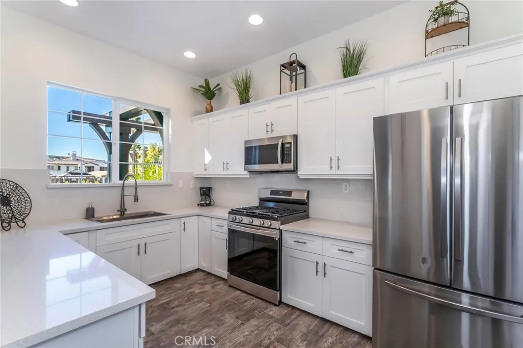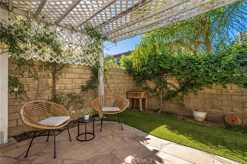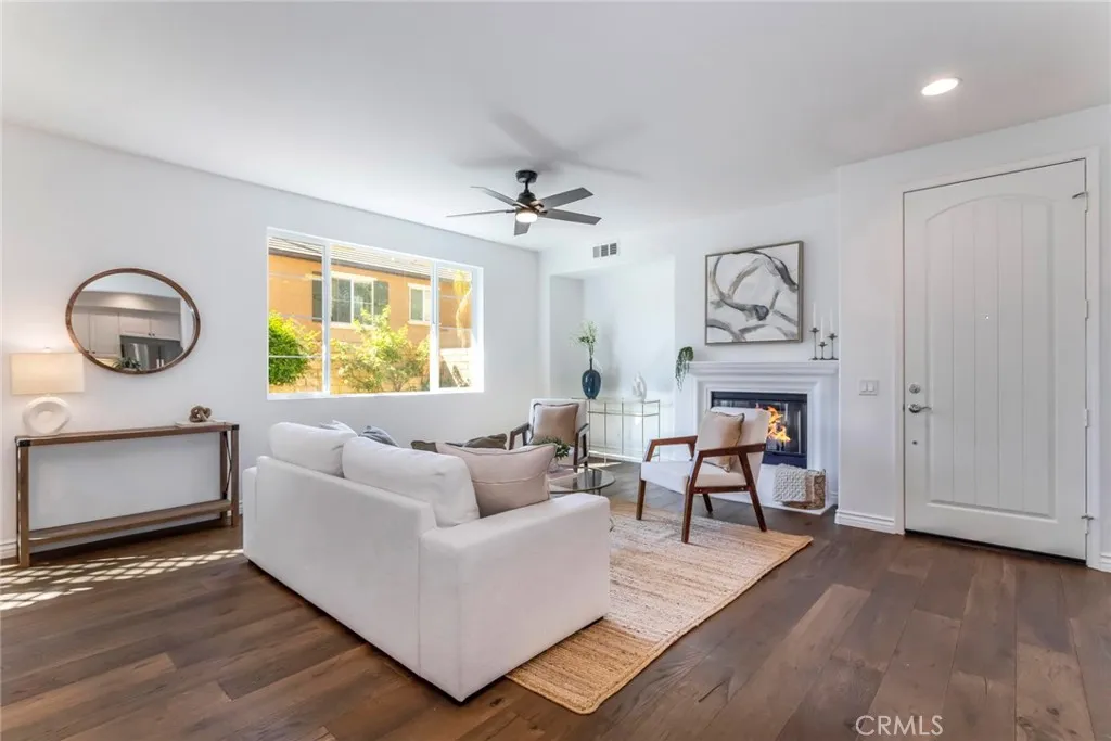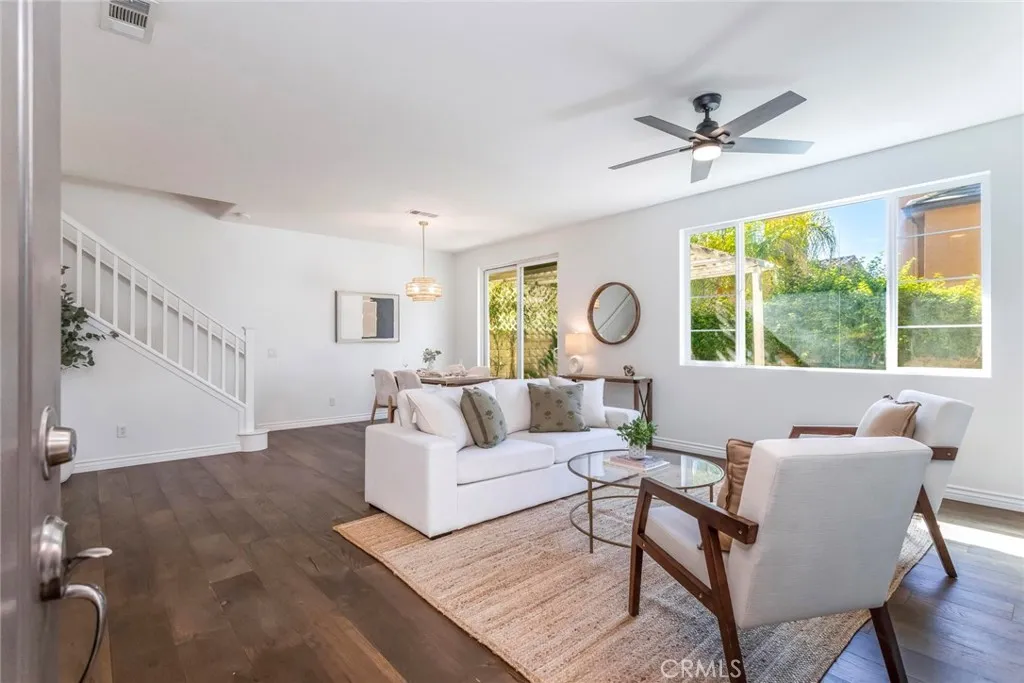 Welcome to this stylishly renovated townhome in the sought after Mariposa neighborhood of Santa Clarita. Spanning over 1,700 sq. ft., this residence offers three bedrooms, three baths with an open floor plan highlighted with lovely neighborhood and backyard views from nearly every window. Step inside to discover warm wide planked wood flooring throughout the main living areas, new inviting paint selections in White Heron and White Picket Fence, plush new carpeting upstairs, upgraded light fixtures, and walls of windows that flood the home in natural light. The kitchen is a chef's dream with an abundance of counter space and cabinetry, stainless appliances and a breakfast nook perfect for casual dining. The generous family room centers around a cozy fireplace, while the dining area is accented with a modern chandelier. Through large sliding doors, you will find the adorable backyard surrounded by gorgeous low maintenance landscape, perfect for al fresco dining and entertaining. Upstairs, the primary suite includes a private ensuite bath with dual vanities and an oversized walk in closet, while the two additional bedrooms share a coordinating bath and are also generous in size with ample closet space. A convenient upstairs office nook is an added plus along with additional linen storage. The two car attached garage is convenient and is adjacent to the indoor laundry area. The home is perfectly located and is just a short distance from the pool, spa, clubhouse and playground. Low HOA and no Mello Roos! Close to award winning schools, shopping, dining, and easy 5 and 14 freeway