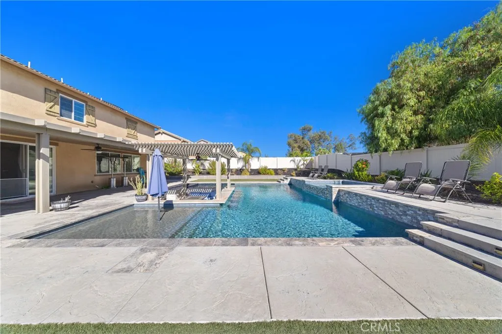 ***OPEN HOUSE 12/20/25. Time: 10am to 1 pm - UPGRADES Furniture is included - POOL HOME** Just reduced Below Market .. TURNKEY- This stunning modern farmhouse, featuring $265,000 in pool upgrades, offers a private backyard oasis complete with a sparkling pool, two waterfalls, a splash pad, and in-water seating beneath an elegant pergola. Spanning 3,404 square feet, the home includes five bedrooms, three bathrooms, and a cozy loft. The interior boasts luxurious vinyl plank flooring and a chef's kitchen equipped with high-end appliances and a double oven. The spacious living room, highlighted by a gas fireplace, opens to a covered patio where you can enjoy the tranquil sounds of the waterfalls. Ideally situated near the 15 and 215 freeways, as well as various dining options and two Target stores, this property perfectly balances luxury and convenience. Opportunities like this are raredont miss your chance to experience resort-style living every day! Schedule your private tour today before this dream home is gone!
