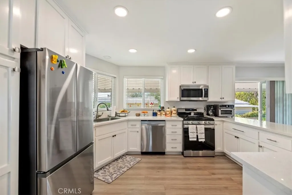 Many buyers have been waiting for a truly elevated home of this caliber to hit the market in the desirable 55+ Sharondale Neighborhood of Calimesa. You own the land and a home with a permanent foundation for conventional financing. Nestled in a beautifully landscaped, drought-resistant yard and backing to scenic mountain and tree views, this move-in-ready single-story residence offers premium finishes and value throughout. Step inside to high ceilings, recessed lighting, and wide-plank white oak-style flooring that flows across an open floor plan. The stunning remodeled kitchen shines with shaker cabinetry, quartz countertops, pull-out shelving, soft-close drawers, stainless steel appliances, and backsplash truly a gourmet space. Double-pane windows offer energy efficiency and quiet comfort. Both kitchen and bathrooms benefit from newer electrical and plumbing, ensuring modern reliability. The primary bath features a separate shower and walk-in tub, quartz counters, updated cabinetry, and newer fixtures. Additional baths follow suit with updated toilets, sinks, and easy-entry showers. Ceiling fans in the bedrooms and living areas provide comfort; fresh paint and premium finishes complete the look. Outside youll find an extended carport accommodating up to three cars, generous storage space, low-maintenance landscaping, and excellent views of the surrounding hills and mature trees. The community is distinguished by a clubhouse, pool, gym, and library maintained by the homeowners association ideal for active and social lifestyles. Located just moments from shopping in nearb