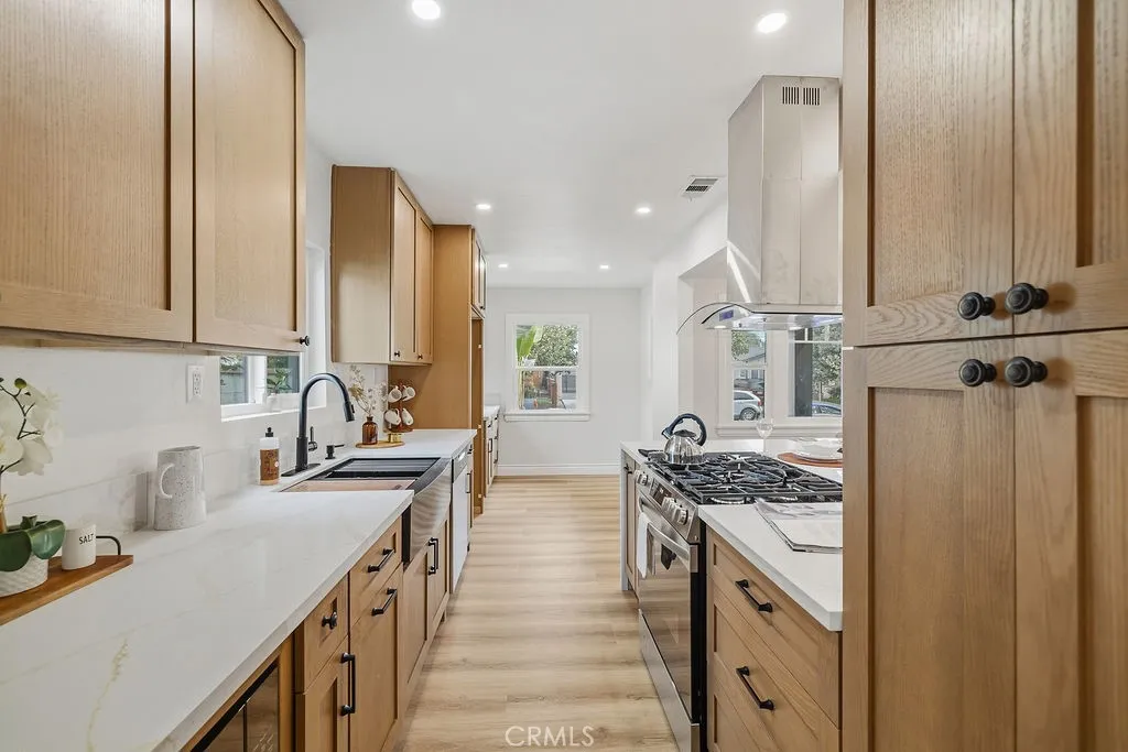 Welcome to 6119 Haas Ave where timeless Spanish charm meets modern sophistication. Nestled in the heart of Los Angeles, this beautifully remodeled 3-bedroom, 2.5-bath home offers 1,304 square feet of thoughtfully designed living space. Every detail was carefully chosen to preserve the classic Spanish character while incorporating elegant, contemporary upgrades for todays lifestyle. Step inside to discover a bright and open layout that effortlessly blends warmth and functionality. Natural light pours into the inviting living room, highlighted by an accented wood-burning fireplace that flows seamlessly into the dining area and spacious kitchen perfect for family gatherings or entertaining guests. The kitchen features natural-toned, soft-closing cabinets, a sleek peninsula with a waterfall quartz countertop, and convenient access to the laundry area and half bath. Down the hallway, youll find two generously sized junior bedrooms on the left, a beautifully updated hallway bathroom on the right, and the serene master ensuite tucked at the end for added privacy and comfort. Outside, the property continues to impress with a detached two-car garage accessible via a gated private alley an ideal setup offering both privacy and security. This home perfectly captures the best of both worlds: the charm and character of classic Spanish architecture paired with the beauty and convenience of modern living. Conveniently located near local shops, restaurants, and just minutes from USC, nearby museums, and Downtown Los Angeles, 6119 Haas Ave is ready to welcome you home.