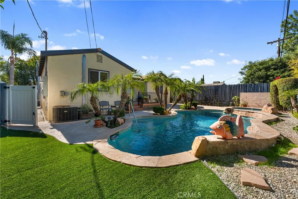 Encino Park home! 4 bedrooms, 3 baths and 2 of the bedrooms are primary bedrooms each with a private bath! Ideal for guests or multigenerational living. Beautiful pool & spa + a yard area! Fully paid for solar panels! Wonderfully maintained residence offers the perfect blend of comfort, style & functionality. Step inside to find smooth ceilings & dual pane windows throughout that fill the home w/natural light. Living room features crown & floor molding, hardwood floors & a true entry w/tile floor, creating a warm & inviting space for relaxing or entertaining. Kitchen is both stylish & practical, showcasing granite countertops, tile backsplash, a stainless-steel sink & faucet, 5-burner gas range & the refrigerator is included! Lazy Susan adds convenient storage & an osmosis water filtration system sits neatly under the sink. Good size dining room opens through a French door w/winglets to your private backyard oasisperfect for enjoying meals while overlooking the pool & spa. The good-size primary suite #1 features a walk-in closet w/built-ins, ceiling fan, glass door to the patio & yard and an attached bathroom with double sinks & a tiled shower/tub combo. Primary Suite #2 offers a ceiling fan, double-door closet, and a private bath with a shower. Bedrooms 3 & 4 feature hardwood floors, a ceiling fan & share the hallway full bath. Other highlights: Indoor laundry closet w/washer & dryer included. Central air & forced-air heating. Raised foundation thruout! Mostly copper plumbing. 1/2 of the roof is new w/a 50-year guarantee. Sprinklers in the front & there is a lovely landsca
