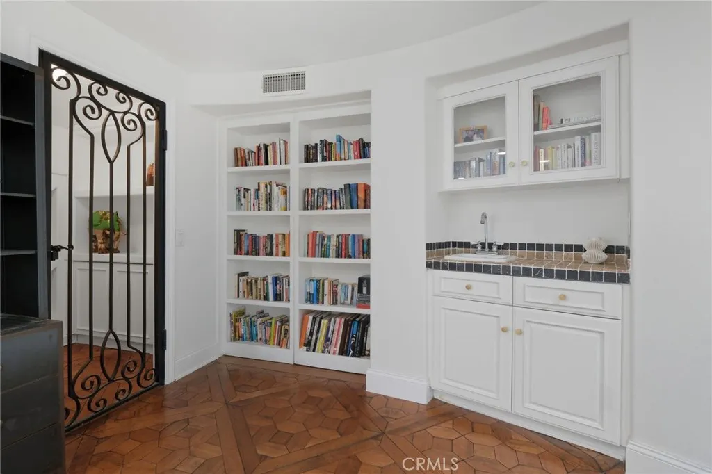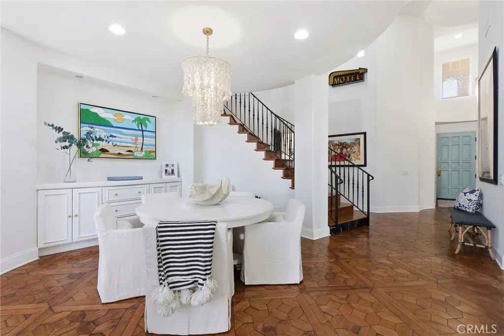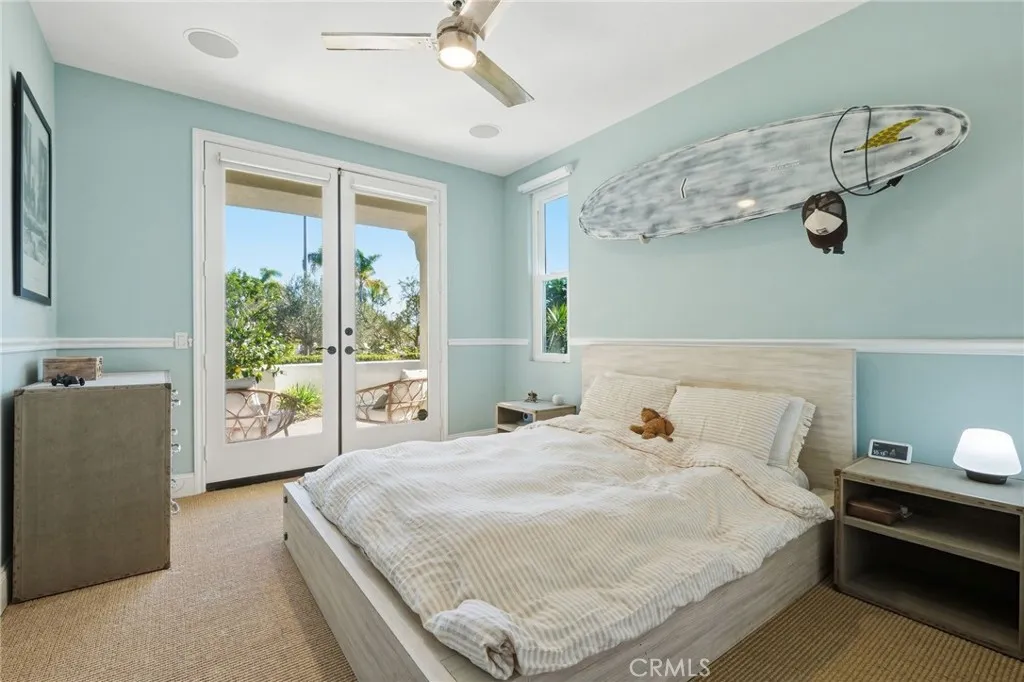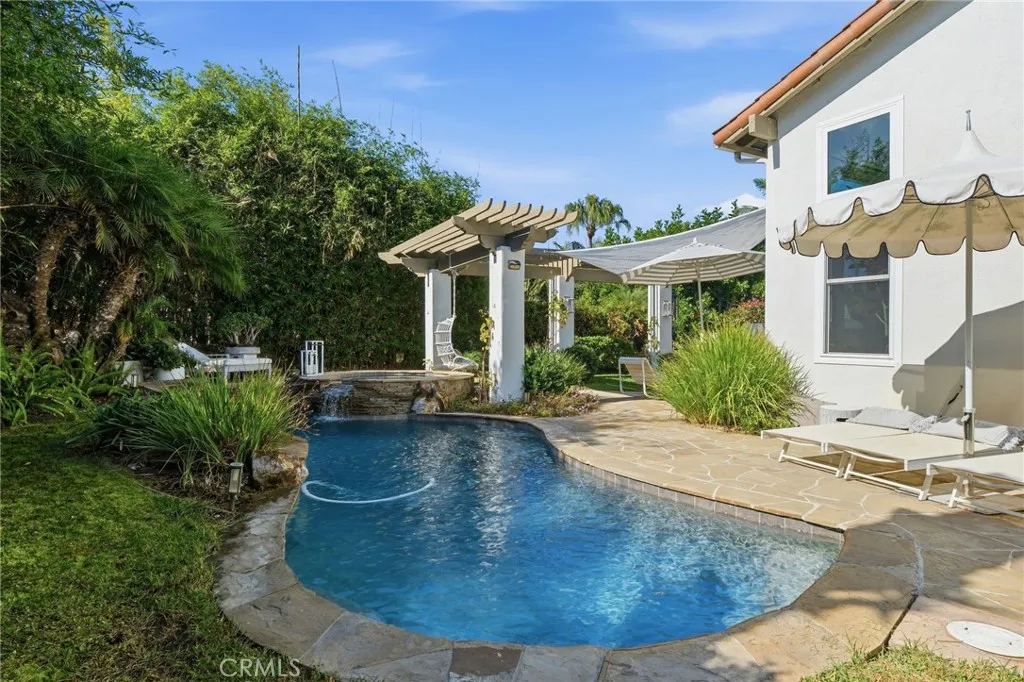 Nestled behind the quiet gates of Bella Lago, this stunning former model home embodies effortless California coastal living where style meets comfort. Set at the end of a peaceful cul de sac, this two story home lives like a one story, with all main living spaces on the entry level. Inside, the open floor plan welcomes you with high ceilings, walls of windows, and Richard Marshall hardwood floors that fill the home with warmth and natural light. An elegant curved wrought iron staircase leads to a circular loft and private retreat, adding architectural beauty and character. The chefs kitchen blends a cool California vibe with restaurant inspired design. Outfitted with Viking appliances, quartz countertops, open shelving, and a spacious island, the space feels both elevated and inviting. It flows effortlessly into the family room with beamed ceilings and a cozy fireplace, making it perfect for cooking, gathering, and entertaining. Upstairs, a private retreat offers a sitting area and wine closet, plus a hidden loft behind a bookcase with a spiral staircase leading down to the primary suite, an unexpected architectural touch and the perfect bonus space for work or relaxation. The primary suite itself offers direct patio access and a serene, private escape. The outdoors is truly a retreat, private, lush, and designed for living well. Enjoy lazy afternoons by the sparkling pool, unwind in the spa beneath the stars, or gather around the fireplace for cozy evenings with friends. With cascading waterfalls, a built in BBQ, and a putting green, every inch of this backyard was made fo