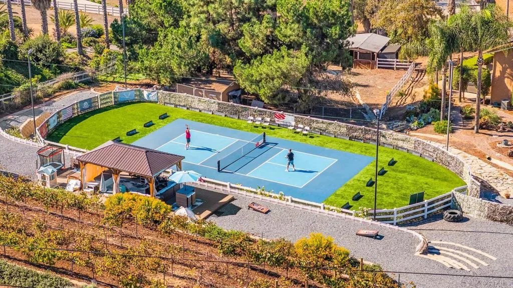 Are you ready for some Pickleball? Indulge in this completely updated hacienda style farmhouse beautifully finished with an attached ADU, privately positioned on a sprawling corner lot along prestigious Via Monserate, featuring multiple dedicated driveway entrances that thoughtfully separate the homes arrival experience from its recreational amenities.The striking custom-finished estate affords an expansive floor plan with vaulted wood-beamed ceilings, skylights, dual master suites, and beautifully crafted architectural details throughout, creating a warm, elegant, and retreat-like living environment.Turn-key and rich with character, inside youll admire the wide-planked wood flooring, the natural light pouring through numerous picture windows, and the seamless flow between the homes multiple living spaces. Carefully curated archways, wood-lined ceilings, and artisan details enhance the timeless farmhouse charm.Step into the heart of the home through two dynamic sets of double wood doorsa prestigious dual-entry design positioned behind the garage and set lower than the street for privacy, framed by 85 mature trees down the property line and a welcoming circular driveway.The kitchen exudes charm with vaulted wood-beamed ceilings enhanced with skylights, white cabinetry, stone countertops, tile backsplash, a copper-style farmhouse sink overlooking the yard, stainless steel appliances, bar seating, and a convenient pass-through into the living room warmed by a cozy cast-iron wood-burning furnace. Multiple formal and casual living spaces, and a formal dining room with floor-to-c