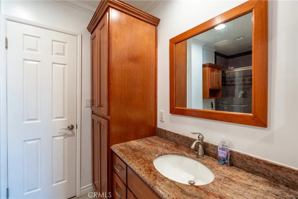Discover this beautifully upgraded spacious two-story townhouse, offering comfort, style, and exceptional functionality throughout. Step inside to find laminate wood flooring, crown and base moldings, plantation shutters, smooth-finished walls, recessed lighting, and double-pane windows that enhance energy efficiency. The home also features both air heating and air conditioning for year-round comfort. The cozy living room showcases a charming fireplace and a double-pane sliding door that opens to a private outdoor patio perfect for relaxing or entertaining. The kitchen is designed for convenience and durability, complete with solid wood cabinetry, Blue Pearl granite countertops, a double-door refrigerator, stove, dishwasher, microwave, water filtration system, and an additional side bar with extra storage. Upstairs, the primary bedroom includes a private covered balcony, a lighted walk-in closet, and an in-wall ironing board with electrical outlet. The spacious second bedroom features a top-of-the-line built-in Murphy bed, custom cabinetry, and a large lighted closet. Both bedrooms share a remodeled Jack-and-Jill bathroom. The upper level also includes ample linen storage and a dedicated washer/dryer area. A steel staircase provides access to a generously sized attic, offering even more storage options. The property includes two assigned parking spaces for added convenience. Community amenities include a Jacuzzi, patio area, and BBQ grill. Ideally located near shopping, dining, and the 405 freeway, this home combines comfort, upgrades, and convenience in one perfect package