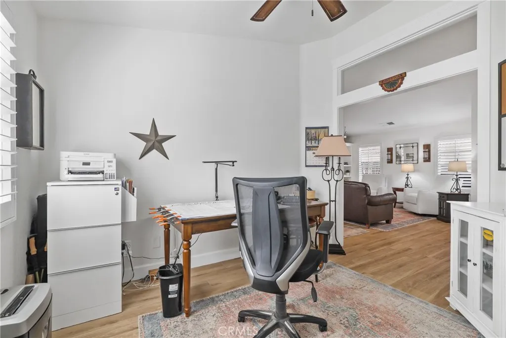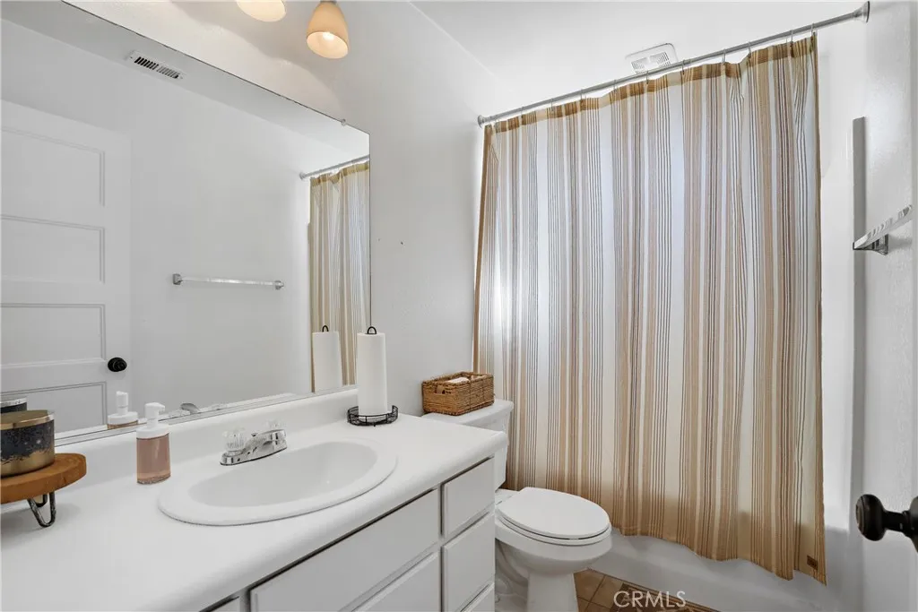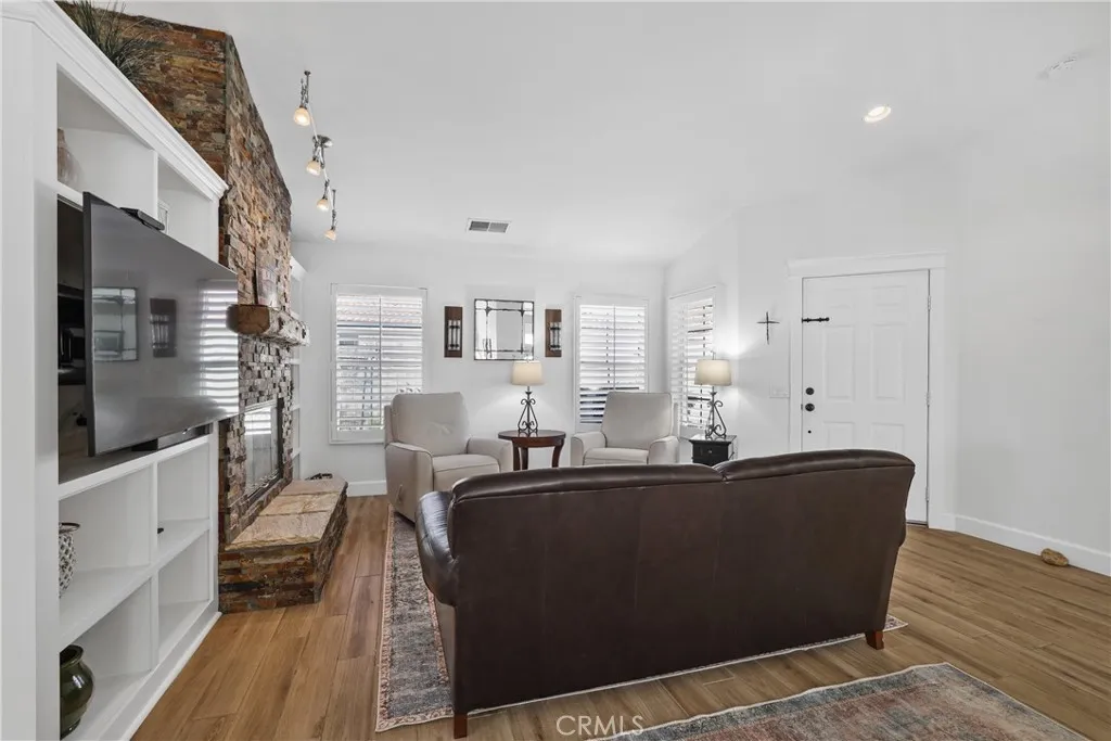 YOU WILL LOVE ALL THE UPGRADES in this spectacular single level home in The Colony, one of SoCal's finest 55+ GATED SENIOR COMMUNITIES. The home has been TOTALLY UPDATED with wood-look tile flooring, plantation shutters and tall baseboards throughout. The kitchen boasts quartz countertops & white kitchen cabinets with soft close doors, stainless steel appliances & sink, updated faucet & lighting. A moveable island offers plenty of room for casual dining and more storage in the kitchen. The living room features a stunning stacked stone fireplace with accent lighting, display shelves & TV niche. You will love the remodeled primary bath with designer shower with rimless glass door, vanity, lighting, faucet & mirror. All interior doors were replaced, updated hardware, spectacular molding and extra cabinets add to the appeal. Bedroom 2 has brand new closet doors added and Bedroom 3 is used as an office/den. Guest bath has a new toilet, new fixtures on the sink and tub and updated lighting & towel bars. There is an extra linen closet behind the fireplace. Upgraded Lennox HVAC system is about 3 years old. The back and side yards offer a peaceful backdrop for outdoor relaxation with a newish aluminum patio cover & you overlook an HOA maintained greenbelt. The oversized lot has a nice side yard separately fenced for your pets or garden enthusiasts. All electrical plugs & switches were replaced. The workmanship & attention to detail make this home ideal for buyers who appreciate top quality. The Colony is a PREMIER SENIOR COMMUNITY for ages 55 and better with a RESORT CLASS CLUBHOUSE
