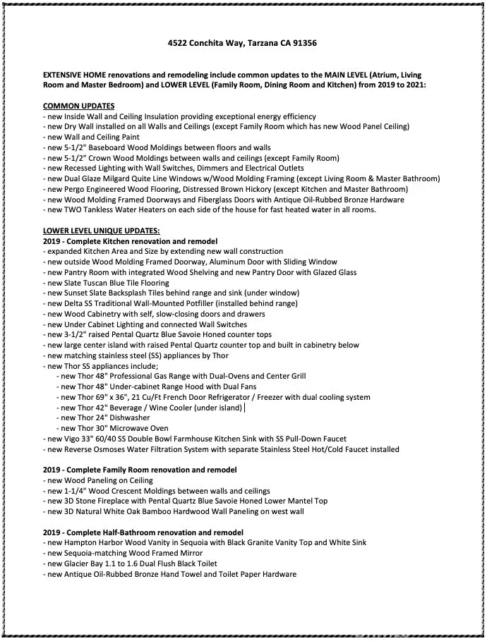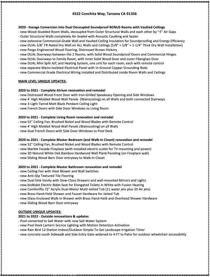 Welcome to your new dream home in the desirable Tarzana hills! A 4-bedroom, 3-bathroom, extensively renovated and remodeled TRI-LEVEL POOL HOME, with 3 separate, fully fenced back yard areas, providing a welcome connection with nature and wildlife, a rare experience in Los Angeles county! With such a prime location and natural appeal, this property will sell quickly, so schedule your showing ASAP as you do not want to miss out! Main Level: Step through the front door into the Atrium and ahead through French doors into the expansive Living Room with dual French doors on the east side drenching the room in morning sunlight while providing direct access to the private salt water pool. Across the Atrium is the spacious primary master bedroom, with marble fireplace, large walk-in closet, and luxurious spa-like bathroom with oversized, glass-paneled Romanesque shower, dual sink vanity, and extra large, multi-jetted tub designed to provide therapeutic back pain relief and stress recovery water pressure massages. Lower Level: A generous Family Room with stone fireplace is perfect for family time. The open layout flows into the Dining Room with south-facing window that lets in sunlight throughout the day. A showpiece is the amazing chefs Kitchen with slate tile flooring, slow-close wood cabinetry, stainless steel appliances, Pental Quartz counter tops, a huge center island, and dual farm sink with built-in reverse osmosis drinking water system. This level also leads into 2 garage conversion bonus rooms, expertly constructed as decoupled and soundproofed recording studio rooms, with