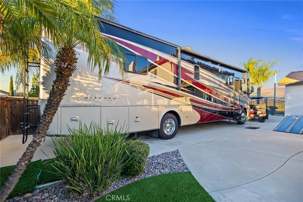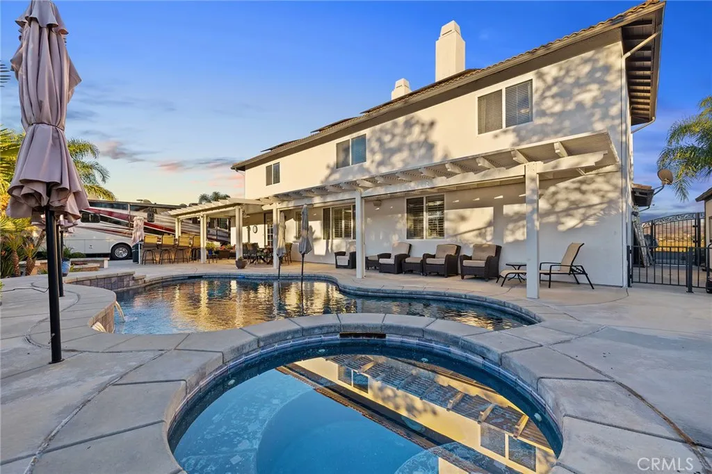 This is the unicorn property you've been waiting for a spectacular move-in ready 5-bedroom, 4-bathroom pool and spa estate with RV parking on a generous nearly 11,000 square foot lot with NO HOA! Sprawling across nearly 4,000 square feet of luxurious living space, this exceptional home features a highly versatile floor plan perfect for comfortable multigenerational living with one oversized bedroom and full bathroom downstairs, plus a den/office that could easily be converted to a 6th bedroom. Freshly painted inside and out, enter through a grand foyer with soaring vaulted ceilings flanked by an elegant formal dining room and a stunning formal living room with cozy fireplace, currently being used as an office. The gourmet kitchen showcases beautiful rich wood cabinetry, convenient double ovens, gas cooktop, an oversized island with gorgeous decorative backsplash, functional butler's pantry with mini fridge and sink, plus a nice-sized pantry, all overlooking the expansive family room featuring a recently remodeled designer fireplace. A dramatic sweeping staircase with striking wrought iron balusters leads to three additional generously sized bedrooms upstairs, one of which is an ensuite with full bathroom, plus another full bathroom and the magnificent primary suite. The luxurious primary suite boasts a huge attached flex/sitting room with convenient wet bar and mini fridge, complemented by a stunning dual-sided fireplace shared between the serene bedroom and versatile sitting area. The spa-like primary bath offers a spacious separate shower, relaxing soaking tub, elegant d