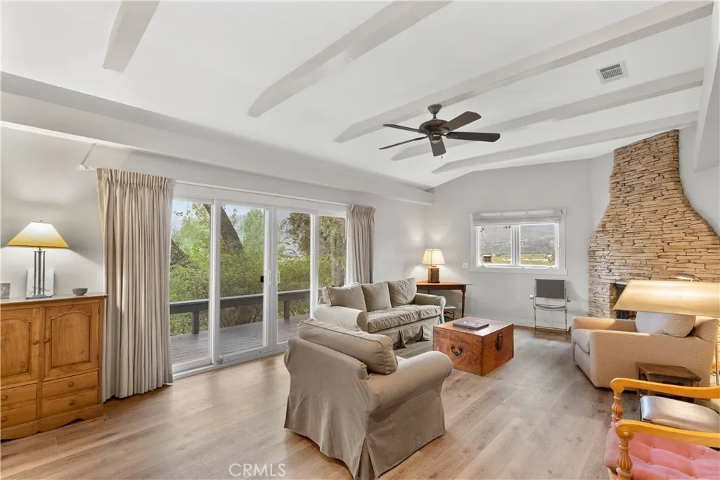 Welcome to your private Ojai retreat! This beautiful property sits on 3 acres of serene land, offering expansive views of the surrounding valley and majestic mountains. The main home, over 3000 sq. ft. features 3 bedrooms and 3 bathrooms, designed to maximize natural light and showcase the stunning scenery. Sit and enjoy viewing the 100 year old oak off the main deck. Your very own private oasis with lush trees and landscaping. Interior boast hardwood floors with newer carpet in hall bedrooms. Fireplaces add the ambiance in the family room and dining room. Dining area has tall conical ceiling. The primary suite has a pot belly stove, walk in closet and wood floors. The primary bath has separate soaking tub and shower all updated. In addition, a 750 sq. ft. guest house built in 2012 provides a private 1-bedroom, 1-bath spaceideal for extended family, guests, rental income, or a private studio. With plenty of room to relax, entertain, and enjoy the Ojai lifestyle, this property combines comfort, functionality, and breathtaking beauty. The guest house has private driveway, covered parking and separate washer/dryer. Think of this as your home away from home with the most beautiful views of Ojai. Close to downtown Ojai with restaurants, shopping and wine tasing.