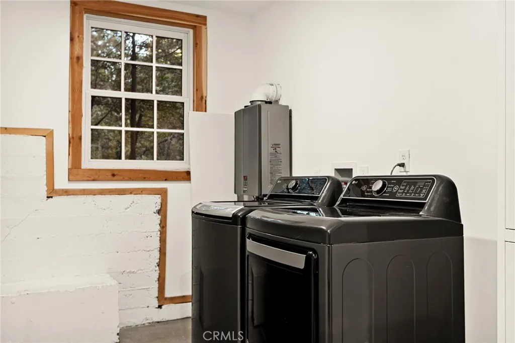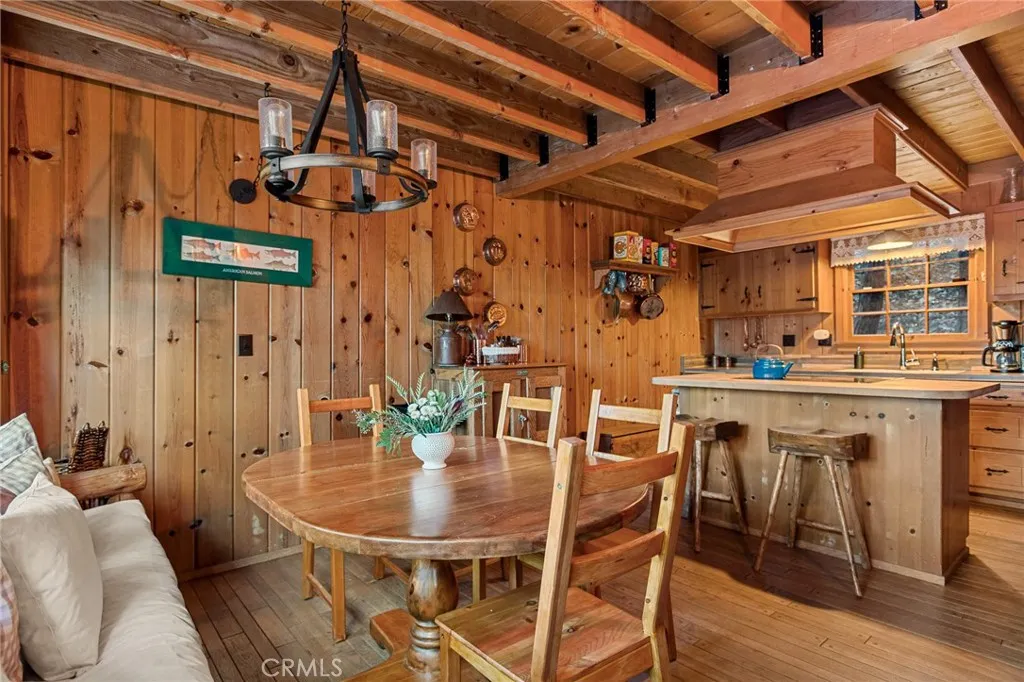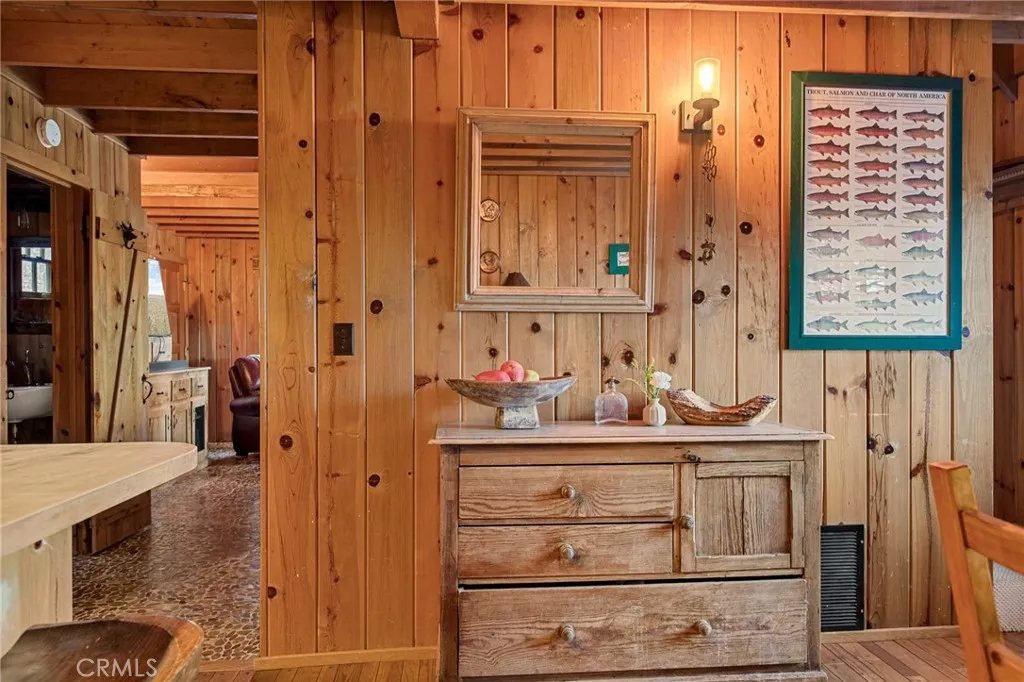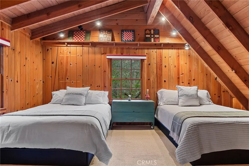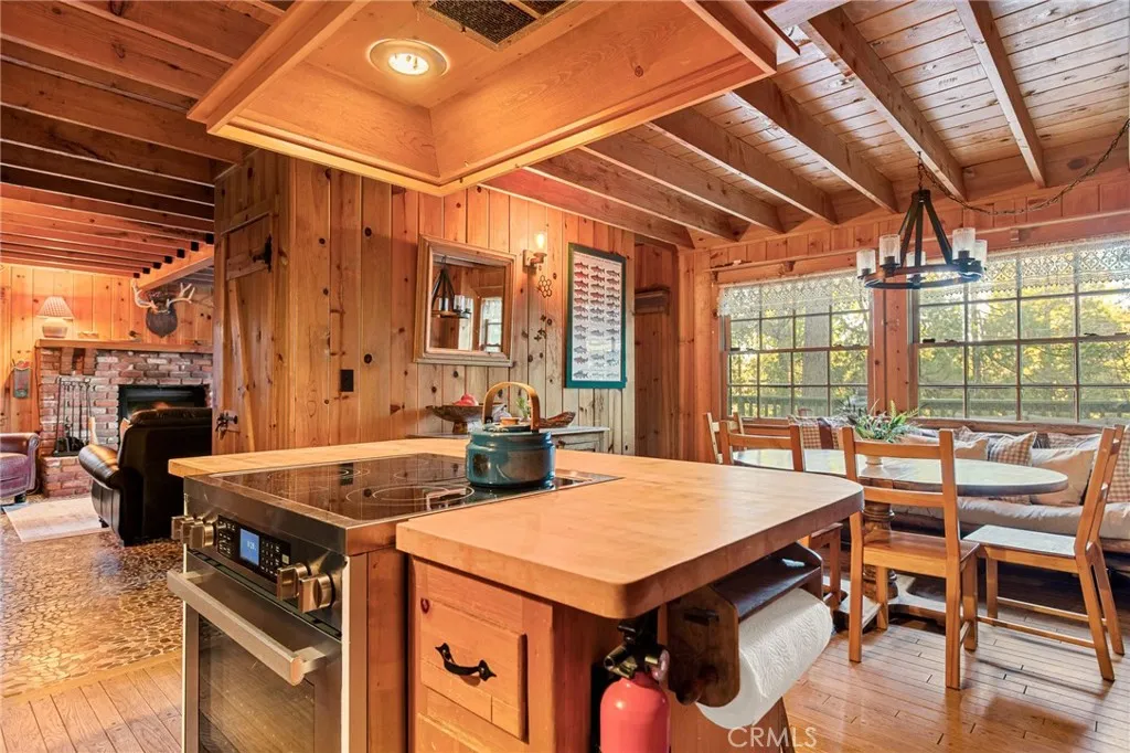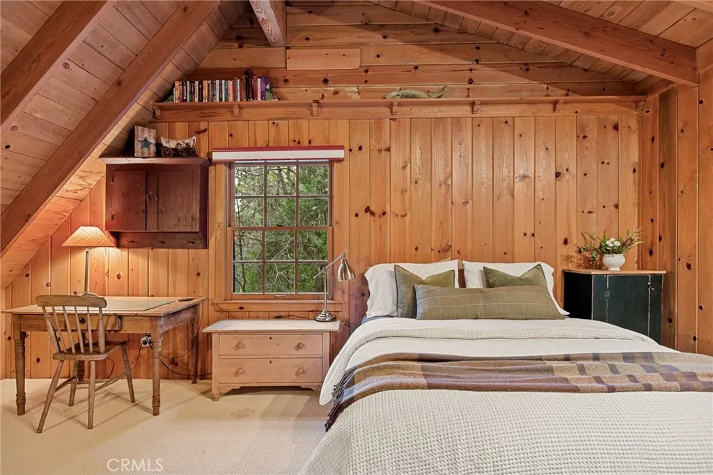 24085 Alpine is a quintessential cabin in the woods with a rare combination of rustic charm and modern upgrades. It's nestled on a wooded hillside just a stone's throw from Lake Gregory and the restaurants and attractions of downtown Crestline. You're greeted by a spacious front deck that offers a sense of tranquility and seclusion. Once inside, you'll find a cozy living room with a fireplace as focal point, tongue and groove paneling throughout and a custom sliced river rock floor that compliments the views of the cedar trees surrounding the cabin. Also on this level is the kitchen with custom hood and carved barstools, new electric range, dining area and a half bathroom. Upstairs are two well appointed bedrooms with vaulted ceilings, spacious closets and a full bathroom - tastefully designed with a natural aesthetic and a heated river rock floor. Underneath the home is a large finished storage room with newer washer & dryer units. The home was built in 1980 by renowned mountain home builder, Skip Kawell, with the intention of creating a home that embodies the nostalgia of a vintage alpine cabin. Upgrades over recent years include: full roof replacement (2017), high efficiency gas furnace and tankless water heater (2018), Level 2 EV charger and induction oven (2024), washer, dryer and exterior paint (2025). The property has a current STR permit and a successful income history. This cabin has a thoughtfully planned footprint that balances comfort and cozy mountain living. If you're looking for a home that invites you to slow down, relax and forget the hustle & bustle of eve
