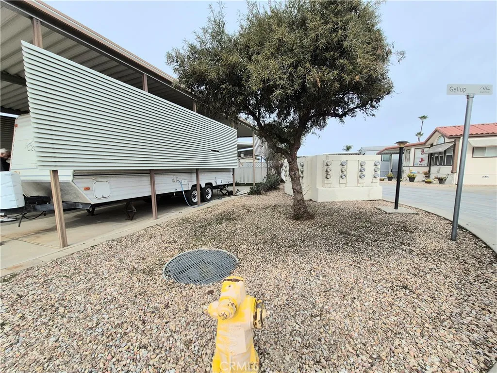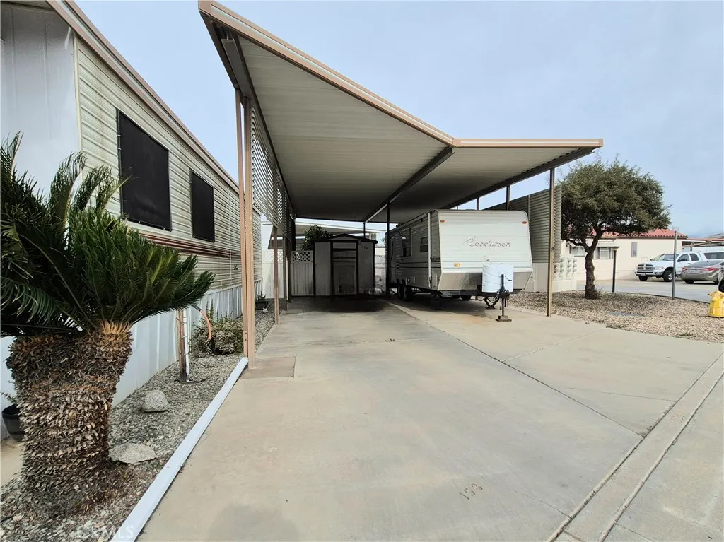 One of the most affordable lots available in the gated 55+ community of Mountain Shadows Resort, you OWN the land beneath your home with NO space rent. This is a B lot with a with shed and large carport covering. The exterior showcases partial vinyl fencing and easy-to-maintain hardscape with a lovely citrus tree. Spend more time enjoying the sunsets and the views of Big Bear mountain range from the convenience of this community. This fantastic 55+ community features state of the art amenities including pool, spa, club house, many events for the active lifestyle: Community dinners, dances, and Saturday Breakfast. So much to do in this gated and secure community. HOA $293/month and covers water, sewer, trash, internet and basic cable. This scenic oasis awaits you. (Trailer does not convey with land)