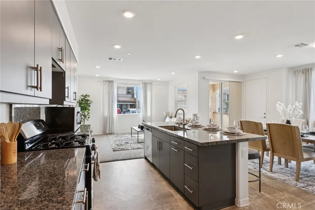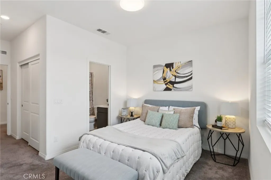 Located in a secure community with low HOA fees, this home offers comfort, functionality, and a well-designed layout. The kitchen overlooks the dining area, creating an open floorplan filled with great natural lightingideal for both everyday living and entertaining. A convenient first-floor bedroom and bathroom provide flexibility for guests, multigenerational living, or a home office, while the first-floor laundry closet adds to the homes practical appeal. Upstairs, the spacious primary suite features an expansive bathroom and private access to a balcony, and an additional bedroom offers comfortable living space. Residents enjoy resort-style community amenities while being just minutes from shopping, dining, and freeway access at Victoria Gardens. Truly move-in ready!