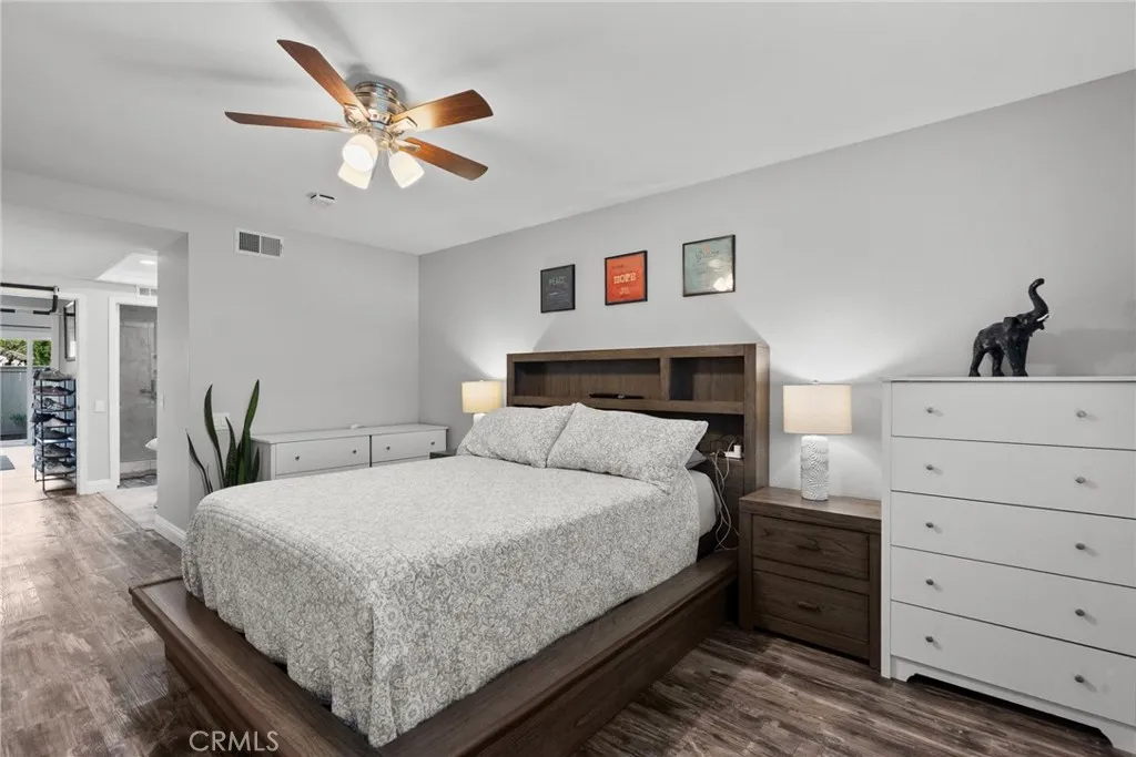 Welcome to this turnkey, single-level detached residence tucked away at the end of a peaceful cul-de-sac in Irvines highly sought-after Woodbridge community. Offering 3 bedrooms, 2 bathrooms, and approximately 1,440 square feet of living space on an oversized 6,100 square foot lot, this home delivers a rare combination of privacy, comfort, and functionality in one of the citys most established neighborhoods. Inside, the thoughtfully designed floor plan features a spacious primary suite with an en-suite bathroom and serene backyard views. A secondary bedroom offers its own private patio with direct access to the front yardperfect for guests, a home office, or flexible living needs. Luxury vinyl flooring runs throughout, complemented by plantation shutters, recessed lighting, and double-pane windows that fill the home with natural light. The inviting living room showcases a rebuilt fireplace, creating a warm focal point for everyday living and entertaining. The kitchen is equipped with stainless steel appliances, stone countertops, and ample storage. Built-in closet organizers and an upgraded electrical panel add both convenience and peace of mind. The home also includes an attached two-car garage and a solar system for added energy efficiency. Step outside to a recently remodeled backyard designed for both relaxation and entertaining, complete with stone pavers, low-maintenance artificial turf, and a cozy firepitan ideal setting for enjoying Southern California evenings with family and friends. Residents of Woodbridge enjoy access to two scenic lakes, two lagoons, 22 pools,