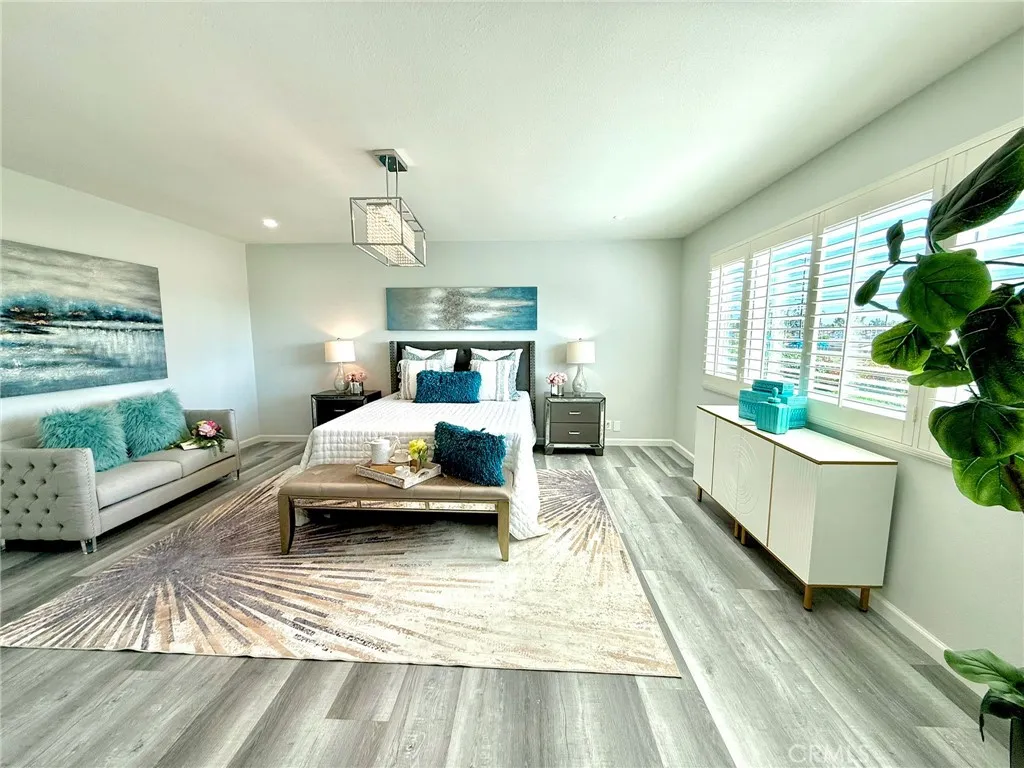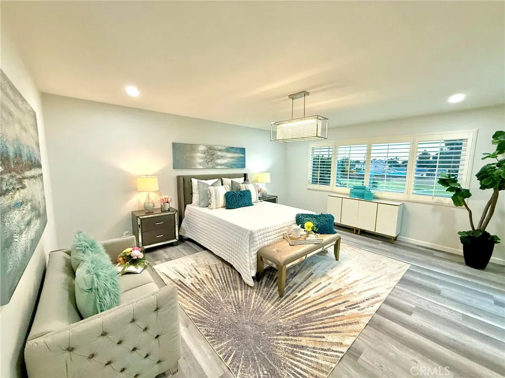 Welcome to this meticulously remodeled, two-level entertainers dream home, perfectly timed for summer enjoyment! Boasting over 2,000 square feet of elegant living space on a generous 6,849-square-foot lot, this 4-bedroom, 3-bathroom residence seamlessly blends modern sophistication with everyday convenience. A highly desirable main-floor bedroom and bath make it ideal for guests or multi-generational living. An impressive, oversized chocolate-cafe wood entry door with a decorative glass sidelight welcomes you into a sun-drenched interior, highlighted by a modern, geometric tiered crystal chandelier. The inviting living room features cathedral ceilings and recessed lighting, flowing naturally into a formal dining area. Neutral waterproof vinyl flooring runs throughout the entire home. The upgraded chefs kitchen showcases quartz countertops and comes fully equipped with a five-burner cooktop, range hood, dishwasher, and a premium 3-door Samsung Bespoke refrigerator with a beverage center. The cozy family room is anchored by a romantic fireplace, tastefully modernized with acoustic slat wall panels and integrated LED lighting. Sliding glass doors create an effortless indoor-outdoor flow to your private backyard oasis, featuring a sparkling lighted pool with fountain and heated spa. Upstairs, the spacious primary suite includes a walk-in closet and a double-sink vanity with a frameless LED mirror. Two additional bedrooms are well-appointed, sharing a modern hallway bath. Additional features include a durable tile roof, covered RV parking, a two-car garage with direct interior a