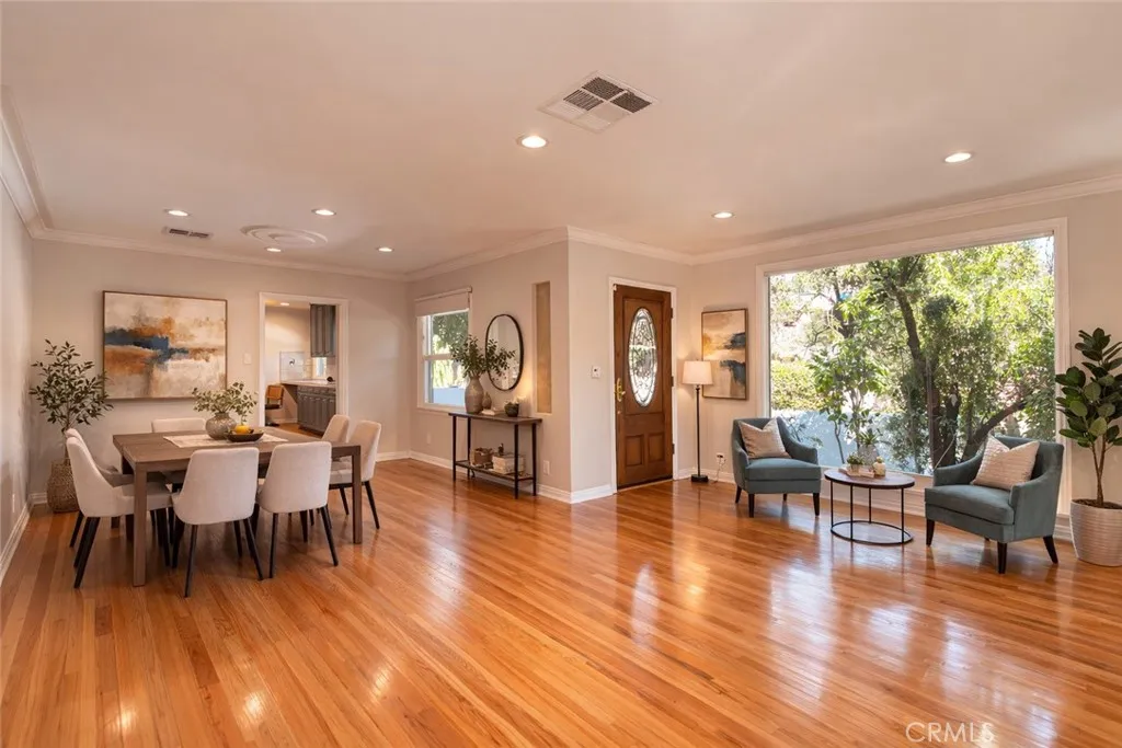 Woodland Hills Spanish-Style Retreat, South of Ventura Boulevard! Welcome to this charming Santa Barbara-inspired residence ideally situated on a desirable corner lot south of Ventura Boulevard. Built in 1949 and thoughtfully maintained, this single-story home offers approximately 2,076 square feet of living space, comfortably situated on a 8007 square foot lot, featuring three bedrooms and two bathrooms, blending timeless architectural character with everyday comfort. Arched wrought-iron gates welcome you into the private outdoors, evoking classic Spanish hacienda design and setting a warm, romantic tone. Classic white stucco, a red tile roof, and graceful arched details which create inviting curb appeal, while mature trees provide shade, privacy, and a sense of established charm. Inside, the home showcases warm hardwood flooring, abundant natural light, and a functional layout designed for both relaxed living and entertaining. The kitchen offers generous cabinetry, upgraded stainless appliances, and ample workspace, flowing seamlessly into the homes living areas. Each bedroom is well-proportioned. The backyard captures the essence of California indoor-outdoor living with a sparkling pool, patio areas, and a private courtyard atmosphere perfect for entertaining, lounging, or enjoying warm Woodland Hills evenings. Located moments from dining destinations, cafs, shopping in The Village & Westfield Topanga Mall, Calabasas Commons, 101 Freeway, Parks, Upscale neighborhood nightlife and commuter routes, minutes from Historical Topanga Canyon and our beautiful coastline & beache
