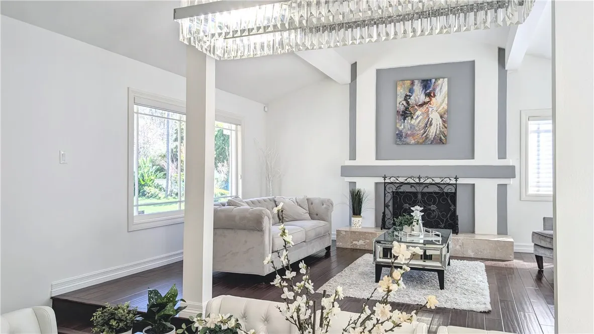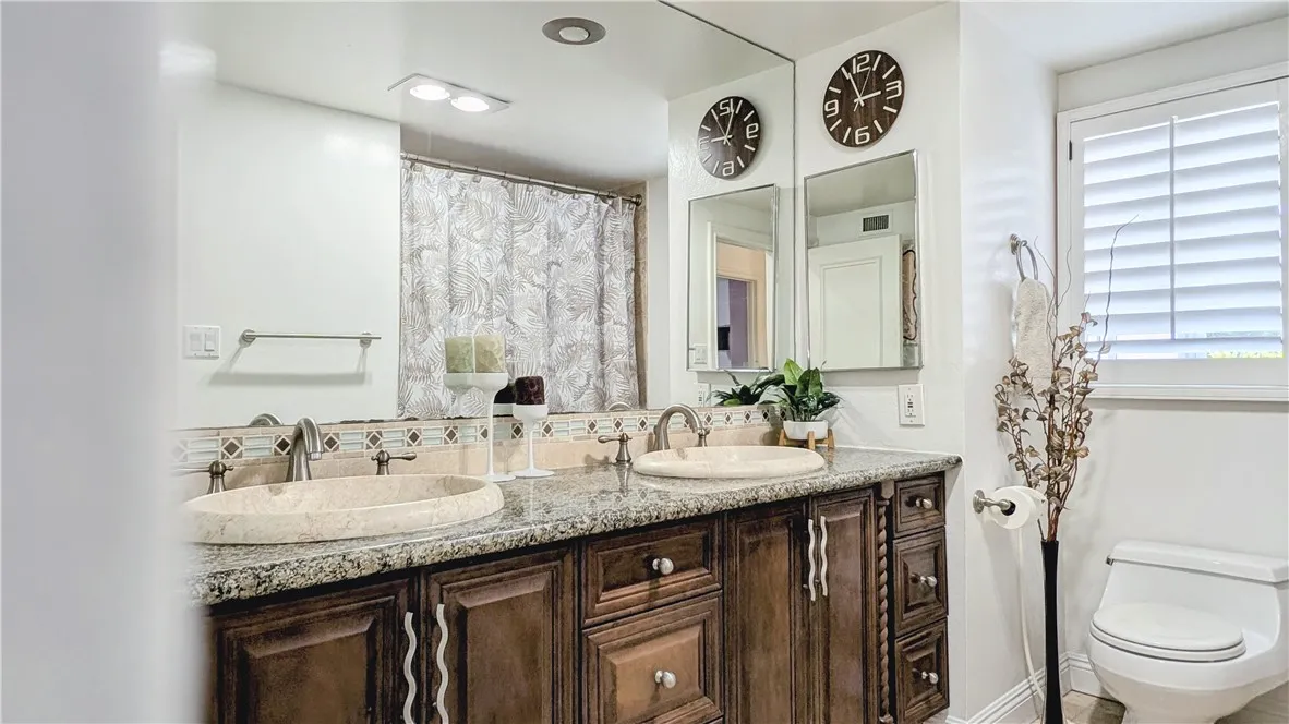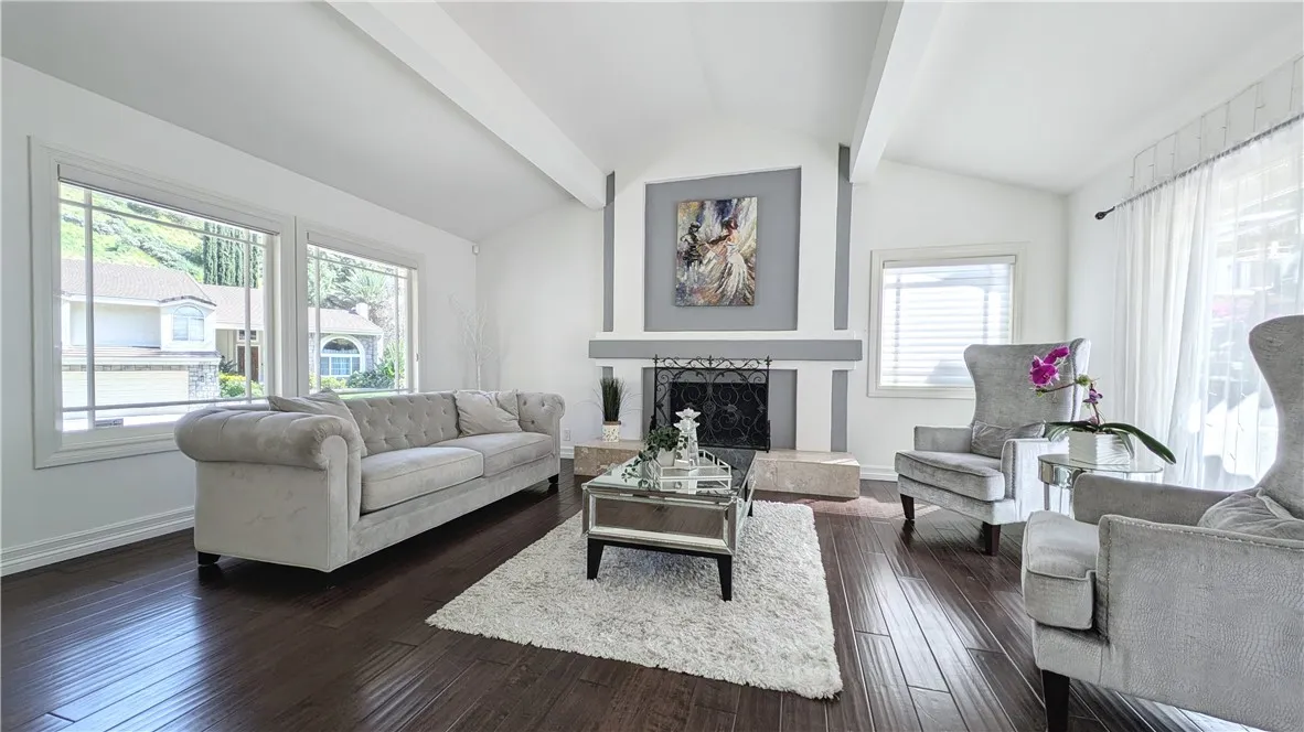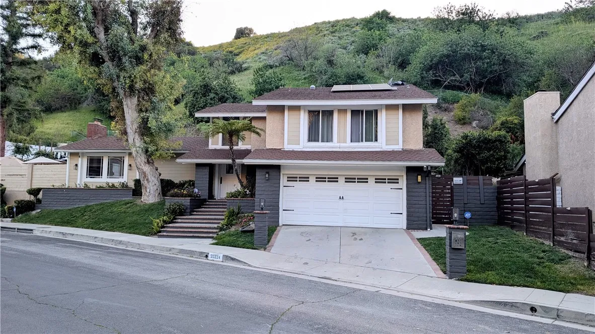 Tucked away on a quiet cul-de-sac south of Ventura Boulevard in the highly desirable Vista De Oro neighborhood of Woodland Hills, this move-in ready split-level home offers privacy, comfort, and resort-style indoor-outdoor living with pool, spa, fully paid solar, and no HOA. Surrounded by architecturally distinct homes and scenic hillside surroundings, the property features a light-filled open floor plan with soaring ceilings, wood and tile flooring, recessed lighting, and over $90,000 in upgrades. A welcoming entry opens to a vaulted living room with gas fireplace, expansive windows, and elegant light fixtures that fill the space with natural light. The kitchen features granite countertops, stainless steel appliances, a newer dishwasher, and travertine flooring. Sliding glass doors open directly to the backyard retreat, creating a seamless connection between indoor and outdoor living while providing a functional and stylish space for everyday living and entertaining. An oversized family room provides an additional gathering space with fireplace, recessed lighting, and French doors. Upstairs, the spacious primary suite offers a dual walk-in closets, a tiled shower, jetted soaking tub, dual vanities. French doors open to a private balcony overlooking the hillside, pool, and beautifully landscaped yard, adding to the sense of charm and tranquility. The backyard is designed for relaxation and entertaining, featuring a covered patio, multiple seating areas, built-in gas and charcoal barbecue, and a saltwater pool and spa with waterfall feature surrounded by mature landscaping.
