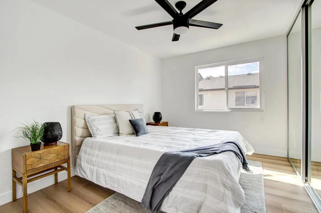 Welcome to this Charming 2-bedroom, 1-bathroom Condo in Santee! The open-concept living room is perfect for relaxing or entertaining. Updated Kitchen: Equipped with shaker style cabinets, quartz countertops and modern stainless steel appliances. Bedrooms and bath are upstairs, downstairs is a spacious living room, dining area, and the updated kitchen. Bonus: the new central air conditioner was installed just last year! The kitchen opens up onto a private, fenced patio, with a storage closet. There is a single space within a multiple-car garage, with storage, and an assigned open parking space in front of the garage. Additional open parking is just in front of the unit, and throughout the complex. For leisure and recreation, the complex features include a large open lawn adjacent to the pool area! The common laundry room is close to the unit.
