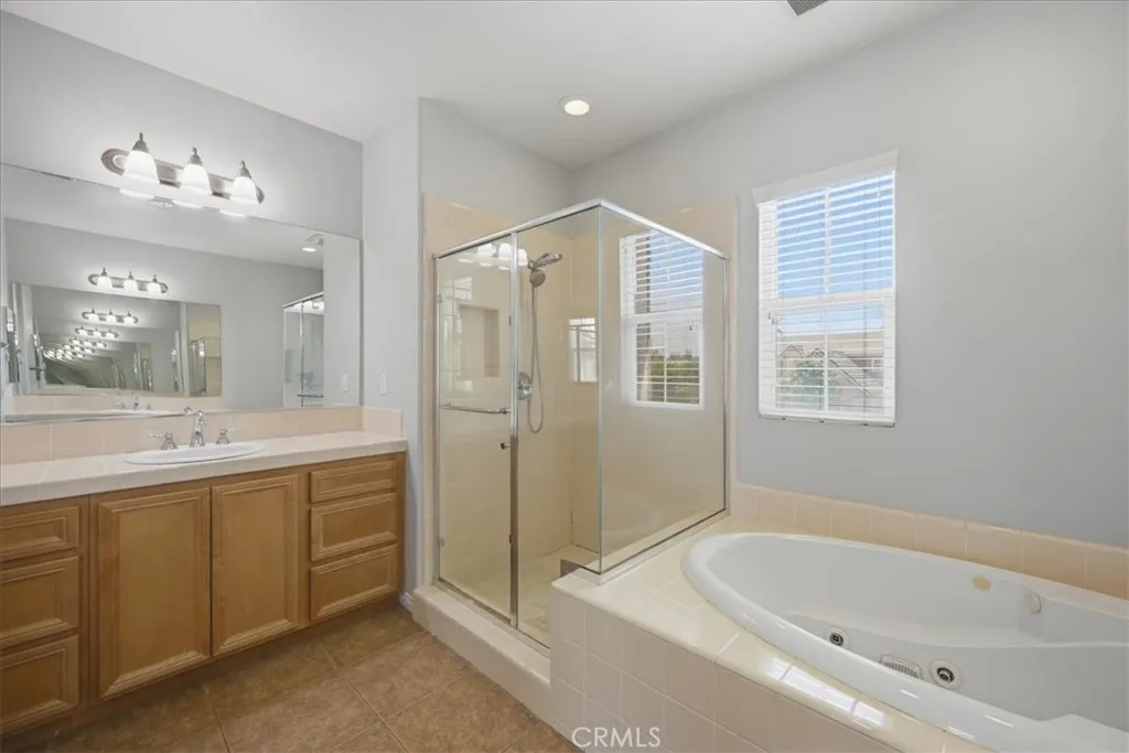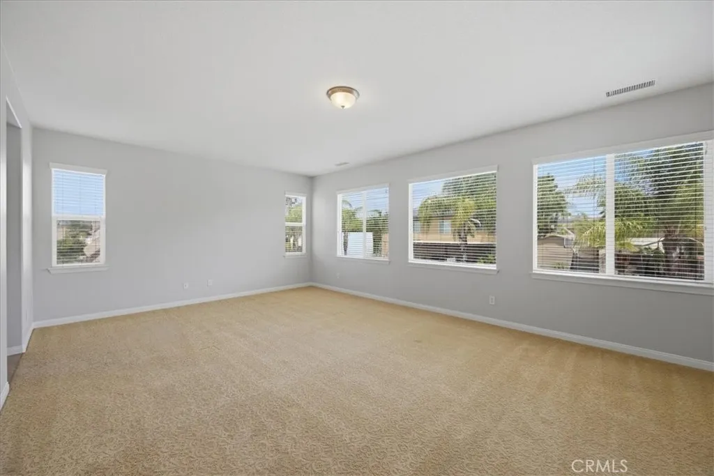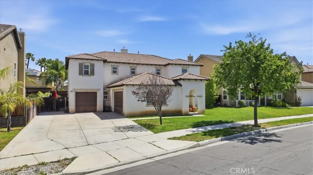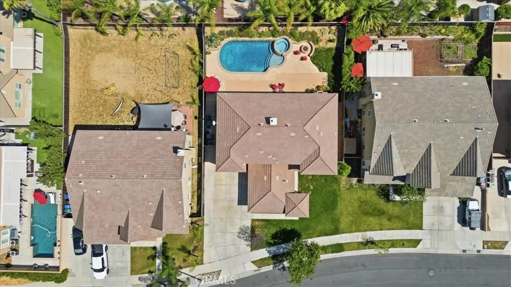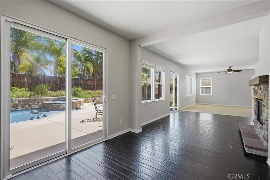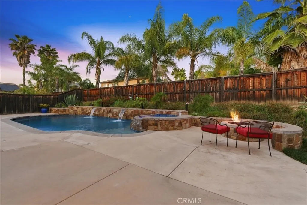 Stay cool inside and out at this Adeline's Farm oasis in French Valley. Take a dip in the pool and enjoy the indoor breeze of your whole-house fan. This Shea-built home features a custom pool with stone waterfalls, spa, and built-in poolside fire pit. Inside, dark wood floors flow through an open living area anchored by a stone fireplace with rustic wood-beam mantel. Four generous bedrooms include a spacious primary suite with wall of windows overlooking the pool, spa-inspired bath with jet tub, glass-enclosed shower, dual vanities, and enormous walk-in closet. Upstairs loft with built-in desk, plus a library or workout niche. Full laundry room with sink, direct-access 2-car garage plus separate 1-car garage for workshop or storage. Temecula School District - French Valley Elementary, Bella Vista Middle, Chaparral High. Minutes to Wine Country and Lake Skinner with community parks and trails throughout.