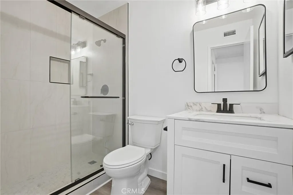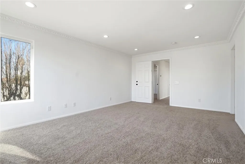 A rare opportunity in Cerritos, this expansive and recently renovated home is designed for multigenerational living or rental potential, offering 7 bedrooms, 4 full bathrooms, and approximately 3,556 square feet of living space on a private 8,139 sq ft lot. Thoughtfully designed with two distinct living wings and ADU potential, the layout offers flexibility for extended family, guests, or future income. The main level offers a spacious layout with soaring beamed ceilings, a gourmet kitchen with newly painted cabinetry, and both formal living and family rooms, each with its own fireplace. This wing includes four generously sized bedrooms, highlighted by a luxurious primary suite with vaulted ceilings, crown molding, an arched sitting area, walk-in closet, private fireplace, and a remodeled bathroom featuring a walk-in shower and new shaker-style vanity. An additional remodeled hall bathroom serves the remaining bedrooms. The upper-level living wing functions like a private apartment, featuring an open-concept kitchen that opens to a living room, three bedrooms including a primary suite with a resort-style bathroom complete with a soaking tub, dual sinks, and walk-in closet, a full hall bathroom, and a stackable washer and dryer. With both interior and exterior access, this space offers privacy and flexibility while remaining part of the main residence. Recent upgrades throughout both levels include new luxury vinyl plank flooring, new carpet, fresh interior paint and baseboards, updated panel doors and hardware, new closet doors, light fixtures, and ceiling fans. Additional