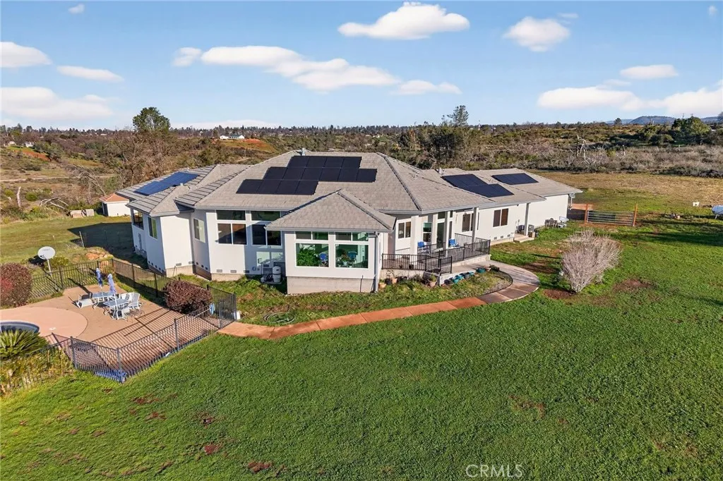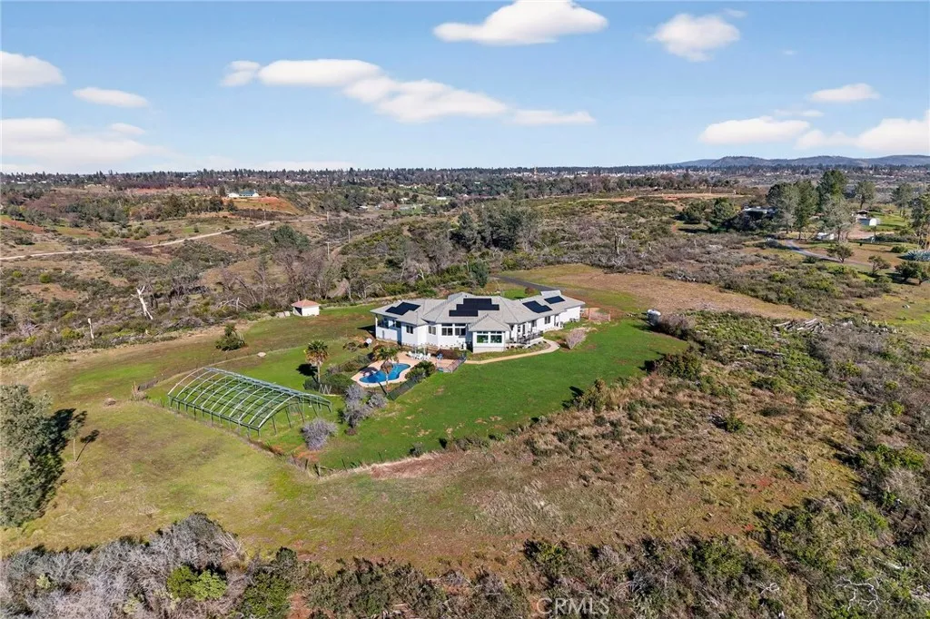 Breathtaking Custom View Estate on 20 Acres with Pool, Sunroom, Solar & Exceptional Self-Sufficiency! Welcome to a truly special Northern California retreatwhere wide-open space, unforgettable views, and thoughtful custom design come together just outside the town of Paradise. Built in 2023, this nearly new 3,001 sq ft custom estate sits on a private, usable 20-acre parcel, capturing spectacular sunrises and sunsets with sweeping views of the Sutter Buttes and the coastal mountain range. From the moment you arrive, the home makes a statement with its massive entry, elegant architecture, and inviting presence. Inside, a split-bedroom floorplan offers privacy and flexibility with 4 bedrooms plus a dedicated office, 2.5 bathrooms, and generous living spaces designed to frame the surrounding landscape. One of the true highlights is the exceptional 160 sq ft sunroom (not included in square footage), perfectly positioned to soak in natural light and panoramic views year-round. This bright, versatile space is ideal for relaxing, entertaining, indoor gardening, or simply enjoying the changing colors of the sky while staying comfortably indoors. The heart of the home features a light-filled great room with soaring ceilings, a cozy fireplace, and seamless flow into the kitchen and dining areas. The kitchen offers ample workspace, quality finishes, and inspiring views that elevate every meal. The primary suite is a private retreat with a sitting or exercise room, a spa-like en-suite bath, and access to a private deckan ideal place to unwind. Two covered porches extend the living space