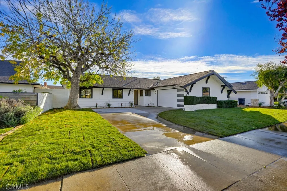 Located in Orange, this fully renovated residence offers a contemporary aesthetic with updated finishes throughout. The exterior features newly laid sod, fresh landscaping with new mulch, and crisp white exterior paint accented by black trim. A large curved driveway leads to a garage with a new garage door, opener, and epoxy flooring. Inside, the home showcases new wood flooring throughout, fresh white interior paint, recessed lighting, and modern black hardware. A small entry hall opens into the main living areas, offering access to both the bedroom wing and the primary living spaces. To one side of the home, a hallway leads to three well-sized bedrooms and a fully updated hall bathroom featuring mosaic tile flooring, a smart toilet, dual-sink vanity, and a remodeled shower. The primary bedroom is also located along this hallway and includes sliding glass doors for outdoor access, along with an ensuite bathroom complete with marble flooring, a dual vanity, and a newly updated shower. On the opposite side of the entry, the home opens into a spacious living and family room with a fireplace and sliding glass doors leading outside. Adjacent to this space is the dining area, highlighted by a chandelier and wooden ceiling, which flows into the updated kitchen. The kitchen features new cabinetry, new countertops, and stainless steel appliances, with additional access back toward the entry. Direct garage access is available from the kitchen, and the garage also opens to the side yard. The backyard offers a fully covered patio with recessed lighting, hardscape elements, a grassy la