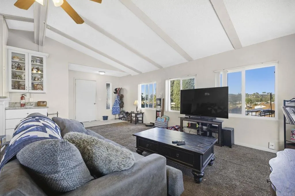 Spacious with vaulted ceilings, this 3 bedroom, 2 bathroom manufactured home offers comfort and functionality. On owned land, no land lease. The open concept layout connects the kitchen, living, and dining areas, with skylights creating a bright, inviting feel throughout. The kitchen features granite countertops and a new range hood. All bedrooms are generously sized, including a primary suite with dual vanity sinks, a soaking tub, and a separate shower. Step outside to a large covered patio with mountain views. The property also includes a detached 2-car garage for extra parking and storage. Located in the desirable Orange Glen Estates community, residents enjoy a quiet, well established neighborhood with a balance of privacy and convenience. Ideally located near shopping, dining, and schools, this home offers convenient access to all that North County has to offer while maintaining a peaceful residential setting.