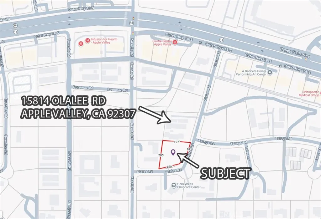 Unlock the potential of this prime multi-family development opportunity in the growing High Desert community of Apple Valley. This 32,000 SF (nearly -acre) unimproved parcel (APN: 0473-113-09-0000) is ideally located on Olalee Road and offers a ready-to-build canvas for your next residential investment. Zoned Multi-Family Residential (R-M), the property allows for up to 20 dwelling units per net acremaking it well-suited for apartment development in a market experiencing steady growth and increasing housing demand. Essential utilities including water, sewer, and power are available at the site, helping streamline development timelines and costs. Positioned near St. Mary Medical Center and surrounded by established medical offices, the location is highly desirable for tenants seeking convenience and accessibility. Residents will also enjoy close proximity to everyday retail and dining options such as Target, Walmart, Albertsons, Starbucks, and Tom's Family Restaurant. Adding to its accessibility, the property is located less than five minutes from California State Route 18 (Happy Trails Highway), providing convenient regional connectivity. Adding to its long-term investment appeal, Apple Valley is set to play a key role in regional transportation with the upcoming Brightline West, which will connect Los Angeles to Las Vegas. With construction anticipated to begin in 2025 and operations projected by 2028, the project is expected to bring approximately 10,000 jobs and significant economic growth to the area. Whether you're a developer or investor, this property presents a rare