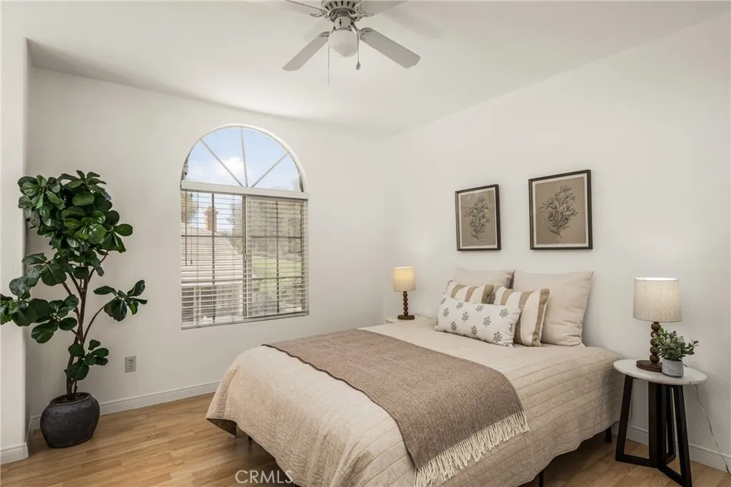 Situated on a quiet street in Woodbridge, 18 Bayfield is one of just 9 homes built in 1999 in the exclusive cul-de-sac enclave of South Lake Villas. Located approximately 600 feet from South Lake, the home offers immediate access to one of the communitys most desirable settings. The property features 4 bedrooms and 3 bathrooms with 1,875 square feet of living space on a 3,522 square foot lot. From the front porch, the entry opens to a spacious living room with vaulted ceilings, upper windows, and a staircase with wood handrail. Natural light fills the space, with gleaming laminate flooring running throughout the home. A fireplace anchors the room, which flows into a dining area located between the living room and kitchen. At the rear of the home, the kitchen includes white shaker-style cabinets, granite countertops with full backsplash, and stainless steel appliances including a gas range with hood, built-in microwave, and dishwasher. A peninsula with bar seating connects the kitchen to the family room, where sliding glass doors open directly to the backyard. A main-level bedroom and nearby full bathroom with bathtub/shower combo are ideal for guests, a home office, or extended living. Upstairs, the primary suite is located at the rear and features vaulted ceilings, a large walk-in closet, multiple windows, and a peek-a-boo view of South Lake. The primary bathroom includes dual sinks, a soaking tub, and a walk-in shower with glass enclosure. Secondary bedrooms also have vaulted ceilings, large windows, and mirrored closet doors. The upstairs hall bathroom includes a tub/sho