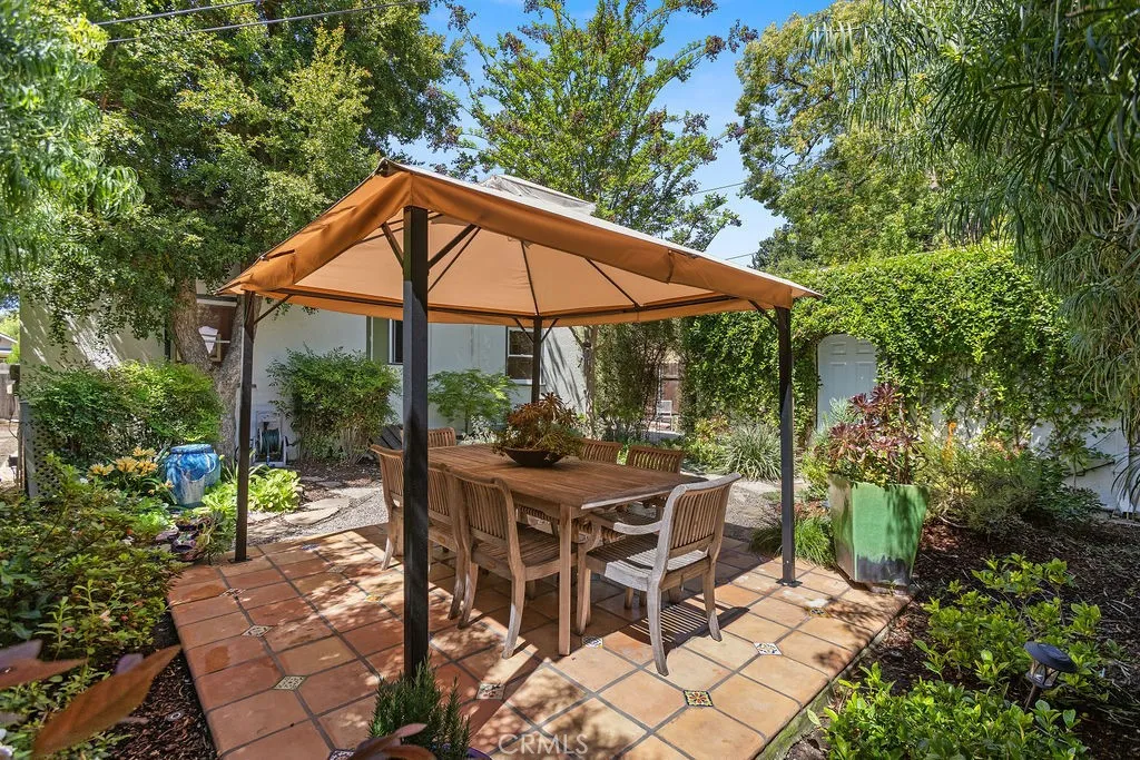 Simply Magical! This vintage Spanish-style is beautifully preserved from a bygone era, blending timeless character with thoughtful modern updates. Meticulous landscaping and raised planter with Spanish inlay guide you to a welcoming front porch, covered in Ludowici roof tile and complemented by a private sitting area framed by mature juniper for added privacy. This 3-bedroom, 1 spacious bathroom with dual sinks and custom tile, offers old-world charm at every turn. Enter and you will be greeted with a light filled living room anchored by a classic brick fireplace and dramatic floor-to-ceiling windows. The formal dining room continues the elegance with matching windows and a vintage statement light fixture. The kitchen is both charming and functional, offering new stainless-steel appliances (including refrigerator) and a cozy breakfast room with a built-in-buffet. A separate laundry room just off the kitchen includes a new washer and dryer, along with direct access to the driveway. Outside the property continues to shine. A long driveway leads to a single car detached garage and a grand garden archway that opens to a serene backyard retreat! Enjoy a terracotta tile-covered patio with a rustic teak dining table seating eight, while flagstone pathways wind through lush, raised garden beds and a tranquil water feature - all surrounded by mature foliage for ultimate privacy. Additional amenities: hardwood flooring; architectural plans to add bathroom + remodel kitchen and laundry without expanding the homes footprint; 2021 - central air conditioning, seismic foundation retrofit