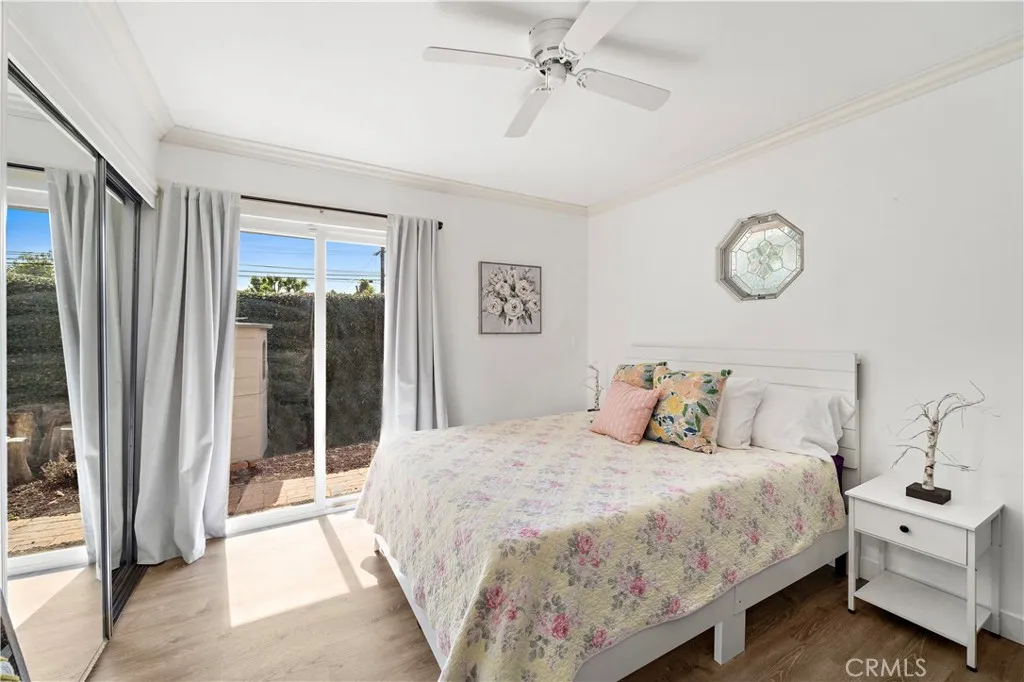 Ideally positioned in the heart of Tustin with quick access to shopping, dining, parks, and commuter routes, this beautifully designed single-level ranch-style home is tucked behind layers of mature landscaping and fencing that create a surprisingly private backyard retreat. Situated on an oversized 8,470 square foot corner lot that backs to the beautiful Pine Tree Park, this light-filled residence offers 4 bedrooms, 2 bathrooms, and over 1,700 square feet with wonderful flow for both everyday living and entertaining. A wide formal foyer welcomes you into the expansive wrap-around living room with fireplace, custom built-in entertainment cabinetry, and extensive built-in shelving, flowing seamlessly into the formal dining room and charming sunlit retro-style kitchen featuring a garden window, tile countertops, coffered ceiling with recessed lighting, white cabinetry with decorative niche shelving, and a breakfast bar. The home is beautifully appointed with wood laminate flooring, crown molding, raised panel interior doors, ceiling fans, central A/C, and a newer roof. French-style sliders open from the living room to a versatile sunroom (California room) that functions as additional indoor-outdoor living space, complete with TV hookups and walls of windows overlooking the spectacular backyard oasis. Designed for true Southern California living, the backyard feels like your own private resort with a sparkling pool featuring Baja-style coved seating, classic brick trim, and a diving board, surrounded by an expansive interlocking paver patio ideal for entertaining, outdoor dini