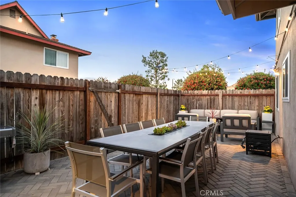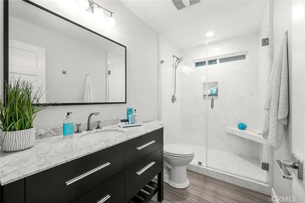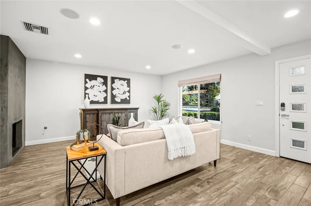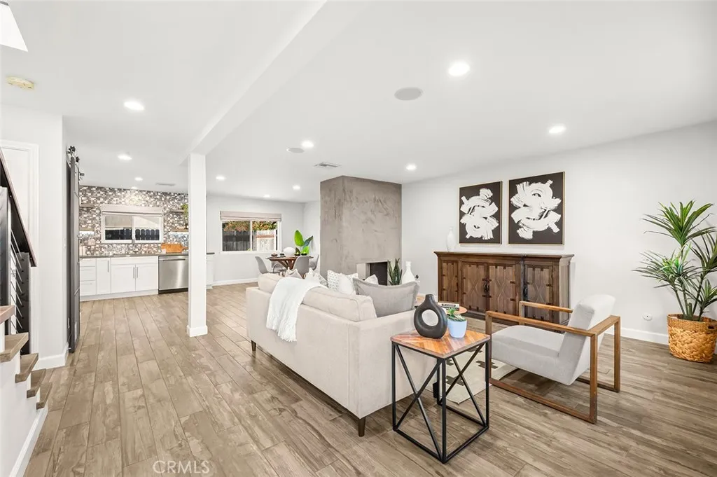 Welcome this beautifully upgraded corner unit home that blends modern design with everyday comfort. This spacious 4-bedroom, 2.5-bath residence is filled with natural light and enhanced by dual pane windows throughout, creating an inviting and energy efficient living environment. The open layout is highlighted by a stunning smooth stucco double-sided fireplace, tile flooring and it offers warmth and ambiance to both the living and entertaining spaces. The home features a gorgeous, modern staircase that serves as a true focal point, complemented by sleek finishes and thoughtful upgrades throughout. The kitchen is equipped with stainless steel appliances, quartz counter tops, white shaker cabinets and flows seamlessly into a stylish wet bar, perfect for hosting and entertaining. Additional highlights include wiring for surround sound, allowing you to create the ultimate in-home experience. Upstairs, the primary suite showcases a fully remodeled bathroom with a walk-in shower and dual sinks, offering a spa-like retreat. Convenience continues with a new stackable washer and dryer and an oversized 2-car garage providing ample storage and functionality. Located within a well-maintained community, residents enjoy access to resort-style amenities including a pool, tennis court, clubhouse, and basketball court bringing recreation and relaxation right to your doorstep. This is a rare opportunity to own a modern, turnkey home in a prime Orange location.