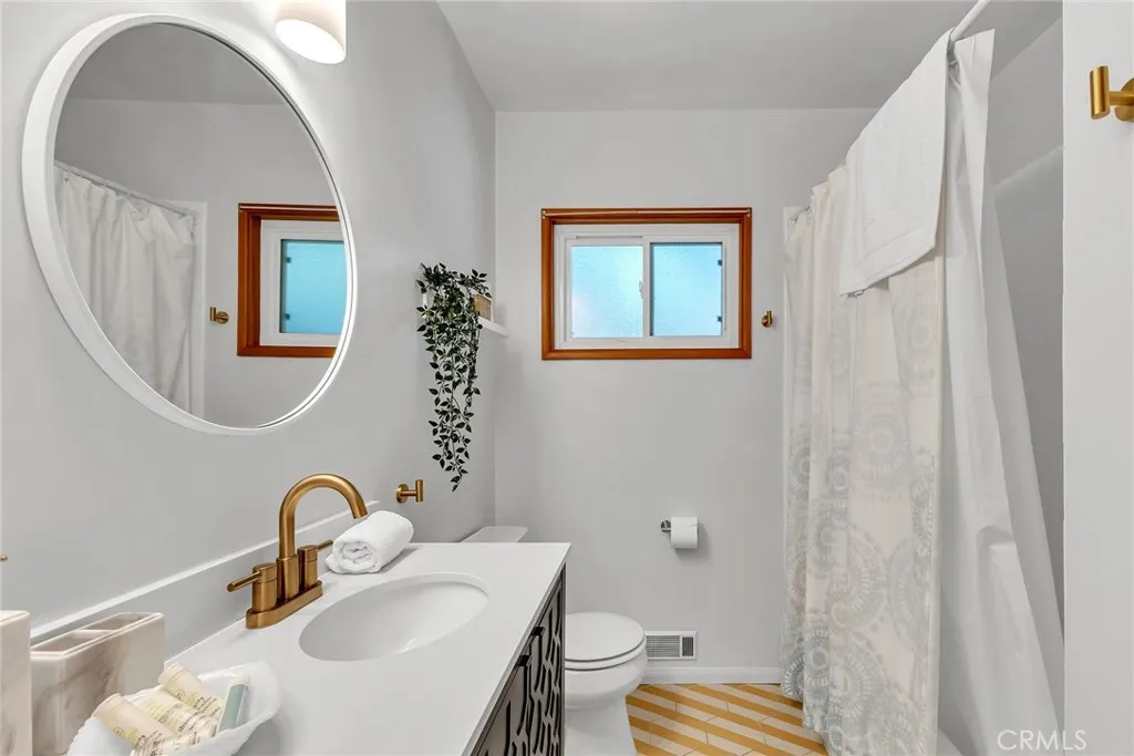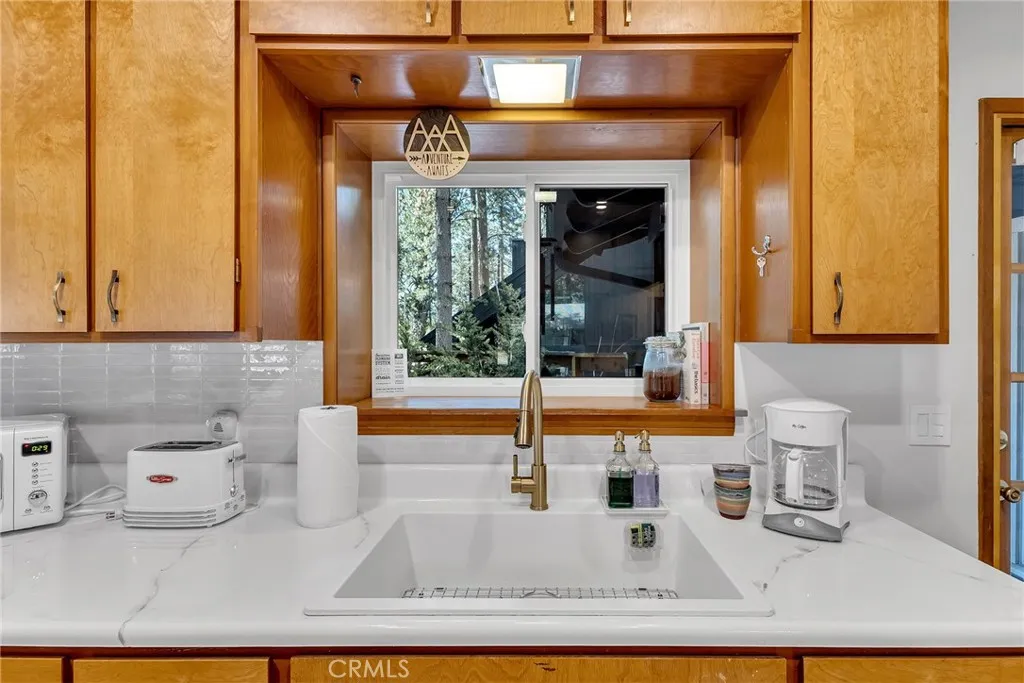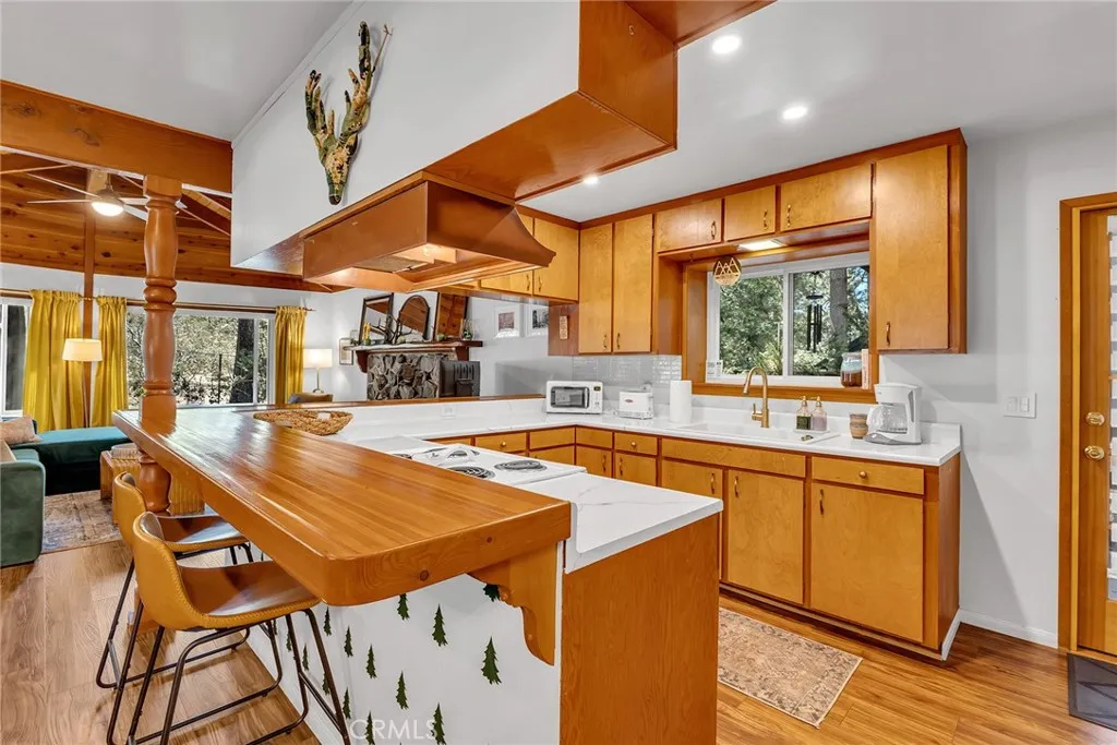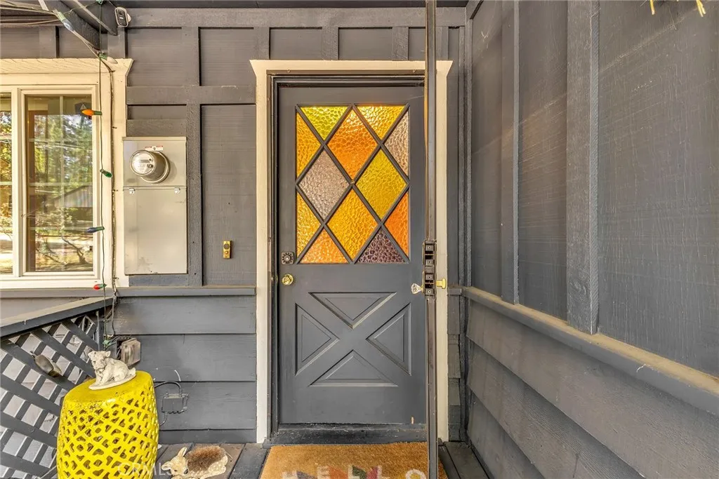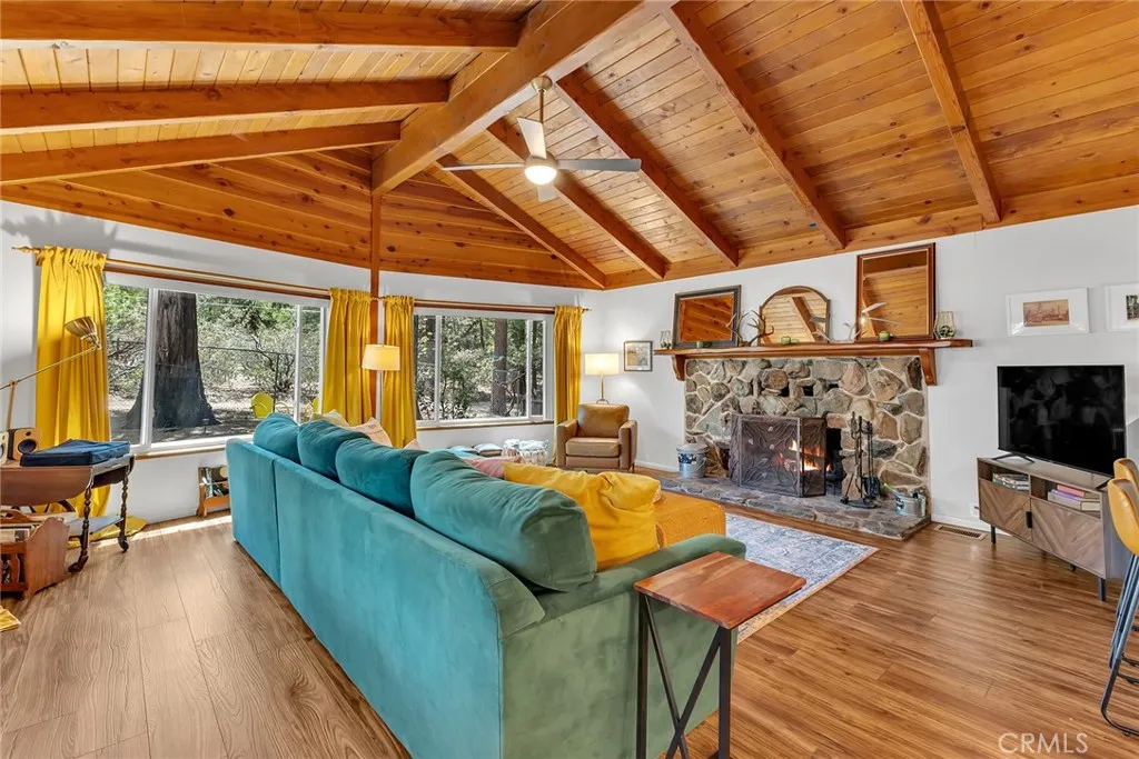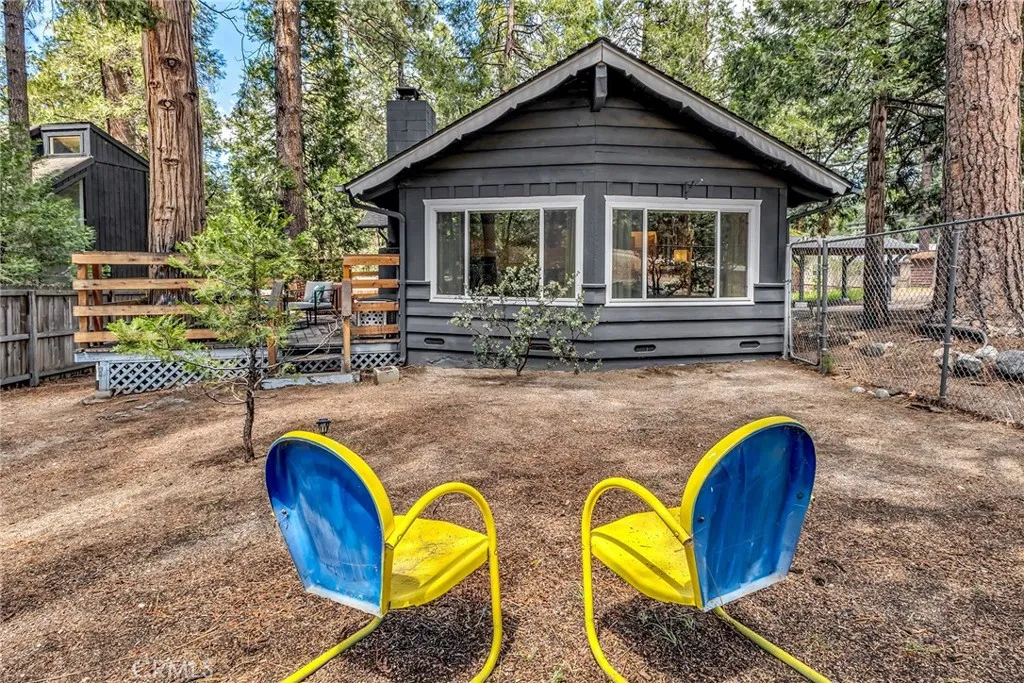 This 1967 updated ranch-style mid-century home offers a comfortable, easy mountain lifestyle with a clean, cohesive feel throughout. Set on a county-maintained road for year-round access, the property features level entry, a carport, and a layout that makes everyday use simple. Inside, engineered bamboo flooring runs throughout, and the refreshed interior brings a subtle mid-century character that feels both current and true to the home. The kitchen is anchored by a wrap-around breakfast bar with generous counter space and storage. Just off the entry, the dining area connects easily to the kitchen, while access to the spacious back deck is just beyond, creating a natural separation between indoor gathering space and outdoor living. One of the bedrooms offers direct access to the deck, adding to that relaxed indoor/outdoor connection. The living room is the heart of the home, with vaulted, beamed ceilings, a river rock fireplace, and large windows that bring in natural light and views of the surrounding trees. Its open, inviting, and comfortable without trying too hard. The bathroom has been fully updated with a clean, spa-like feel that adds a touch of everyday comfort. Both bedrooms feature built-in closets and cabinetry, a classic mid-century detail that adds function and character. The backyard is fully fenced, making it a great setup for pets, while the rest of the lot remains open and usable. A large, forested neighboring parcel adds a sense of space, privacy, and a natural backdrop. Offered furnished, this is a move-in ready mountain home that combines charm, function