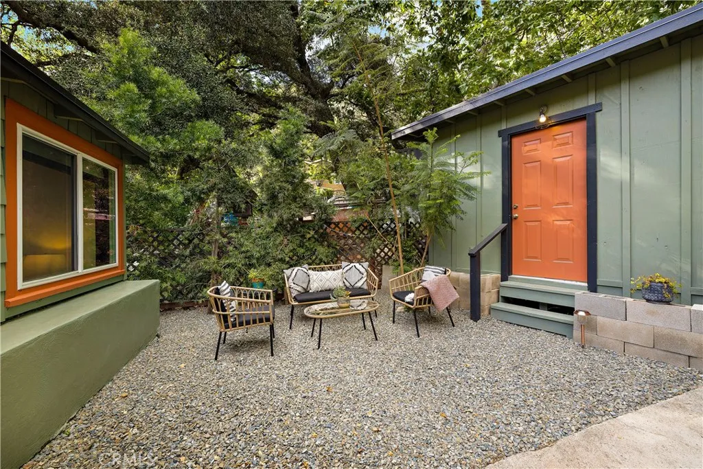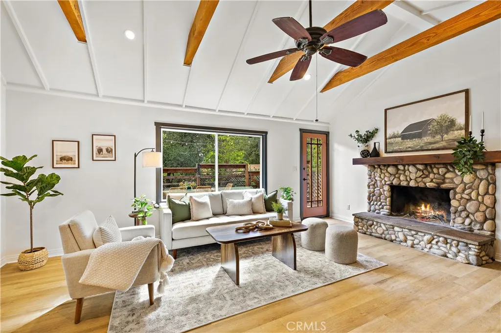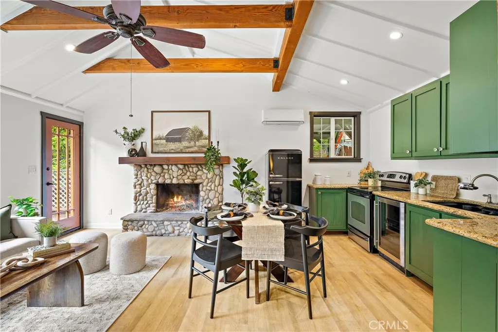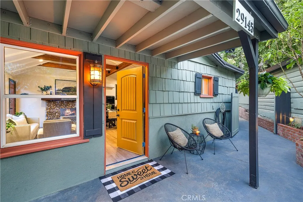 Nestled among mature sycamore and oak trees in a peaceful, nature-filled setting, this beautifully updated single-level home offers the perfect escape. Enjoy quiet mornings on the front porch or unwind in the evening surrounded by serene canyon views. Inside, an airy open-concept layout features soaring ceilings with exposed wood beams and a striking vintage rock, wood-burning fireplace. Fresh interior and exterior paint brighten the space, complemented by upgraded luxury vinyl flooring throughout. The open kitchen includes a stainless steel electric range, refrigerator, and wine refrigerator - all included in the sale. The primary bedroom features picture windows overlooking the backyard, a closet, and ceiling fan. Spacious bathroom off hallway features tiled shower and beautiful wood vanity w/ ample storage. Approximately 13 years ago, the home was extensively remodeled with copper plumbing, updated electrical, dual-pane windows, drywall, rafters, insulation, and a tankless water heater. The private backyard features a workshop/storage shed, while the front yard offers a raised-bed vegetable garden and a beautifully designed outdoor dining patio, enhanced by soft string lighting - perfect for relaxed evenings or entertaining guests. Additional features include laundry facilities on side yard, a mini-split HVAC system, and parking for two vehicles. Located in a one-of-a-kind historic community known for its close proximity to the Cleveland National Forest trails, community park, local dining, and a number of local events throughout the year. This home offers a rare escape