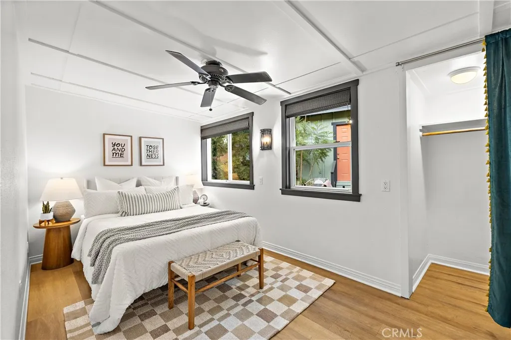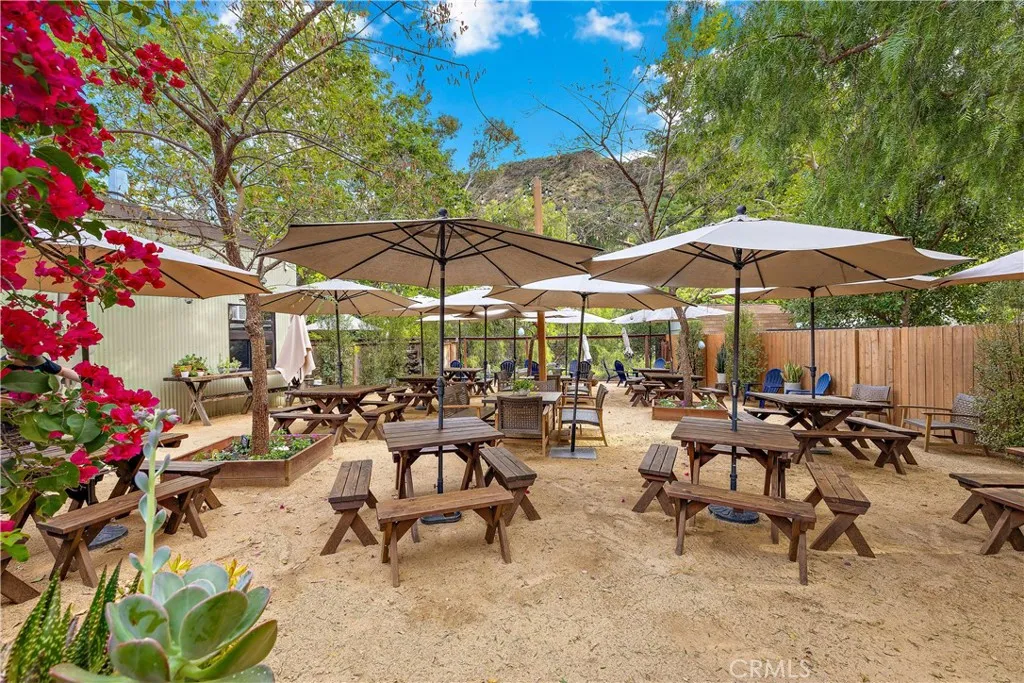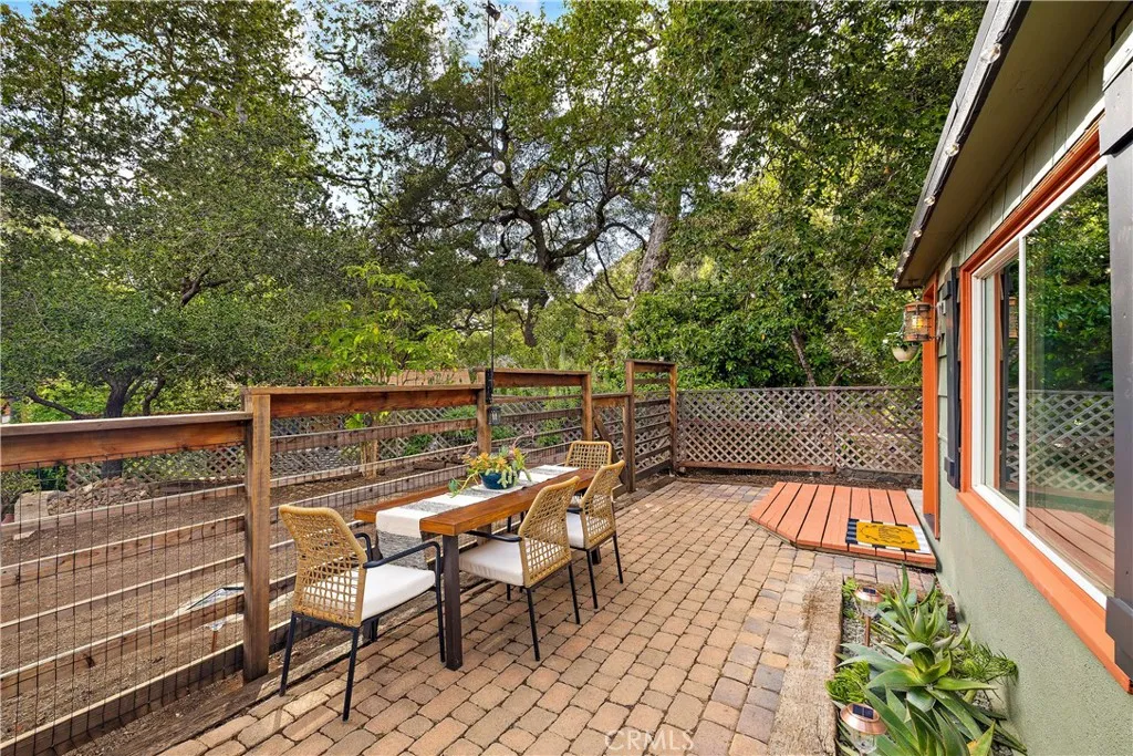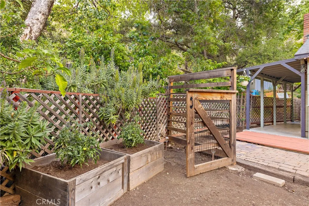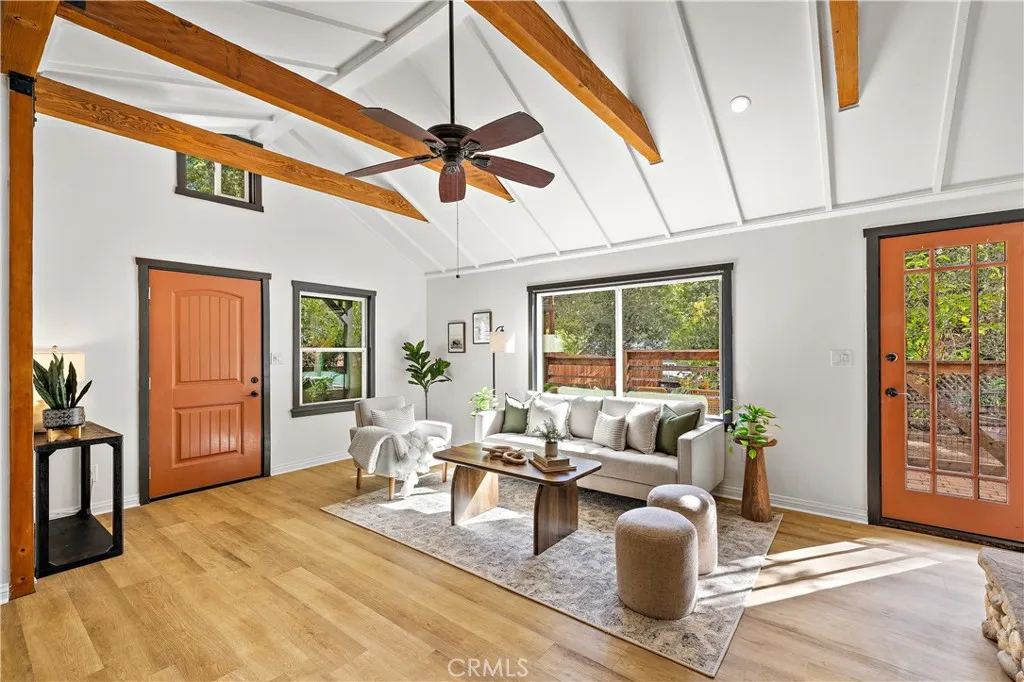 Nestled among mature sycamore and oak trees in a peaceful, nature-filled setting, this beautifully updated single-level home offers the perfect escape. Enjoy quiet mornings on the front porch or unwind in the evening surrounded by serene canyon views. Inside, an airy open-concept layout features soaring ceilings with exposed wood beams and a striking vintage rock, wood-burning fireplace. Fresh interior and exterior paint brighten the space, complemented by upgraded luxury vinyl flooring throughout. The open kitchen includes a stainless steel electric range, refrigerator, and wine refrigerator - all included in the sale. The primary bedroom features picture windows overlooking the backyard, a closet, and ceiling fan. Spacious bathroom off hallway features tiled shower and beautiful wood vanity w/ ample storage. Approximately 13 years ago, the home was extensively remodeled with copper plumbing, updated electrical, dual-pane windows, drywall, rafters, insulation, and a tankless water heater. The private backyard features a workshop/storage shed, while the front yard offers a raised-bed vegetable garden and a beautifully designed outdoor dining patio, enhanced by soft string lighting - perfect for relaxed evenings or entertaining guests. Additional features include laundry facilities on side yard, a mini-split HVAC system, and parking for two vehicles. Located in a one-of-a-kind historic community known for its close proximity to the Cleveland National Forest trails, community park, local dining, and a number of local events throughout the year. This home offers a rare escape