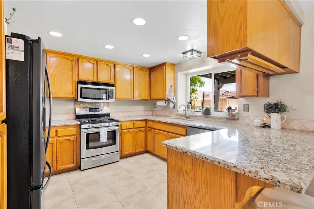 Welcome to this great home in Hesperias highly desirable Mesa area, where you get space, views, and a location thats hard to beat. Just minutes from Hesperia Golf Course and Hesperia Lake, this is a neighborhood people love to call home. As you arrive, youll notice the attractive curb appeal with a half moon driveway, tile roof, RV parking, and a fully fenced lot that offers both privacy and functionality. There is also a covered front porch, perfect for enjoying your morning coffee or relaxing in the evening. Inside, you are welcomed by a spacious living room featuring a beautiful stacked stone fireplace that creates a warm and inviting atmosphere. The kitchen offers granite countertops, stainless steel appliances, and plenty of space for cooking and gathering. The home includes thoughtful upgrades such as newer windows installed approximately 2-3 years ago, along with shutters that were added about 1-2 years ago, giving the home a clean, updated look while improving energy efficiency. Additional features include ceiling fans in all bedrooms and an indoor laundry room complete with cabinets and a sink for added convenience. Step outside to a large covered patio with additional concrete for easy maintenance and flexible use. The backyard is perfect for entertaining or simply enjoying the open feel and mountain views that the High Desert is known for. The solar system helps keep energy costs down, adding long term value and efficiency. With a two car attached garage, RV parking, and a layout that offers both comfort and functionality, this home is a great opportunity in one