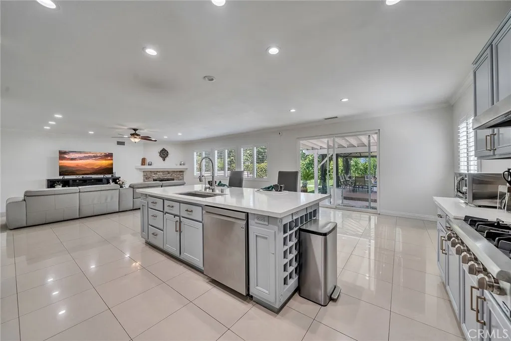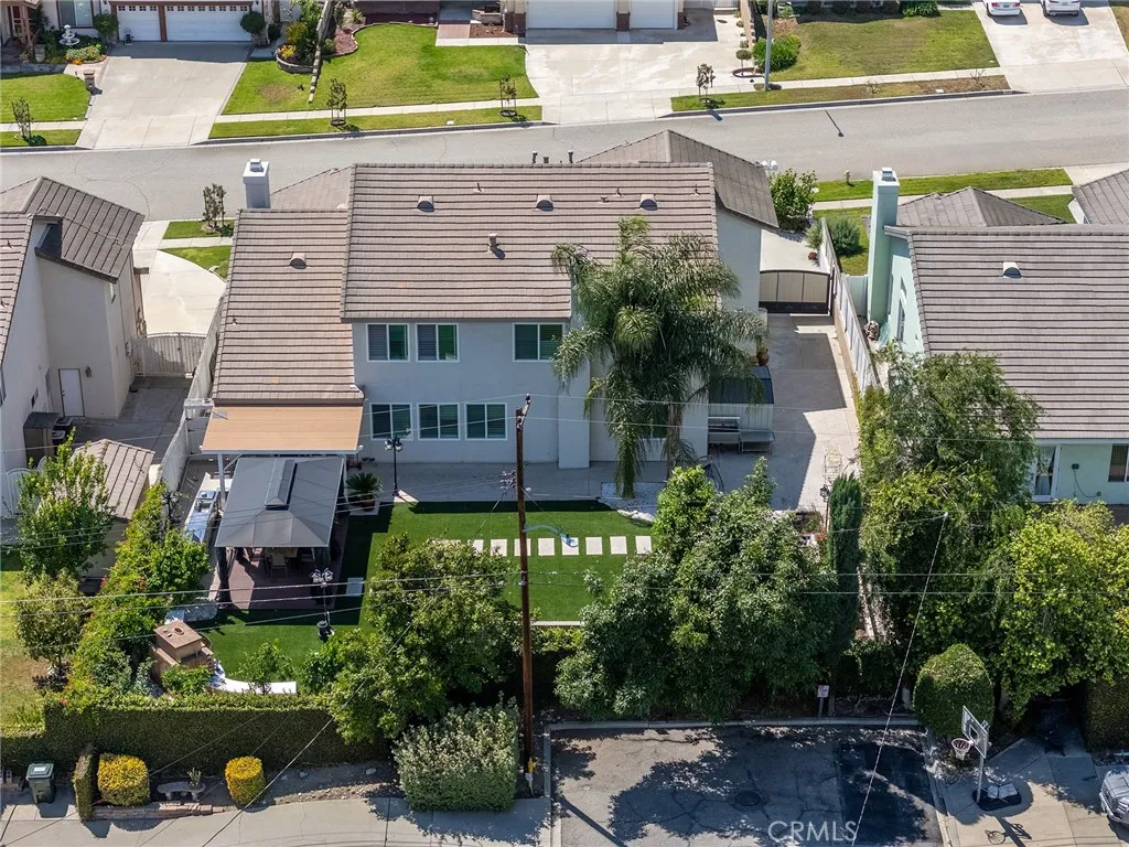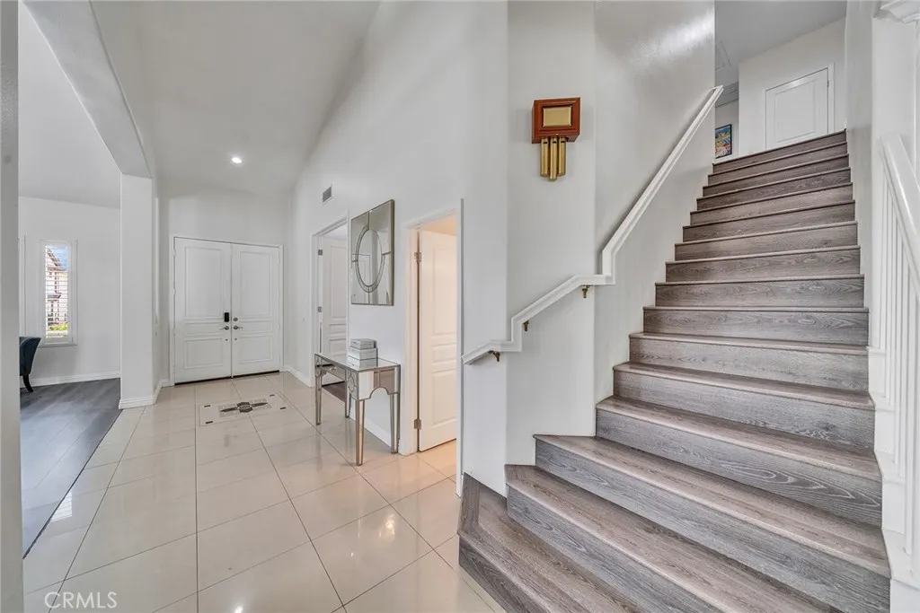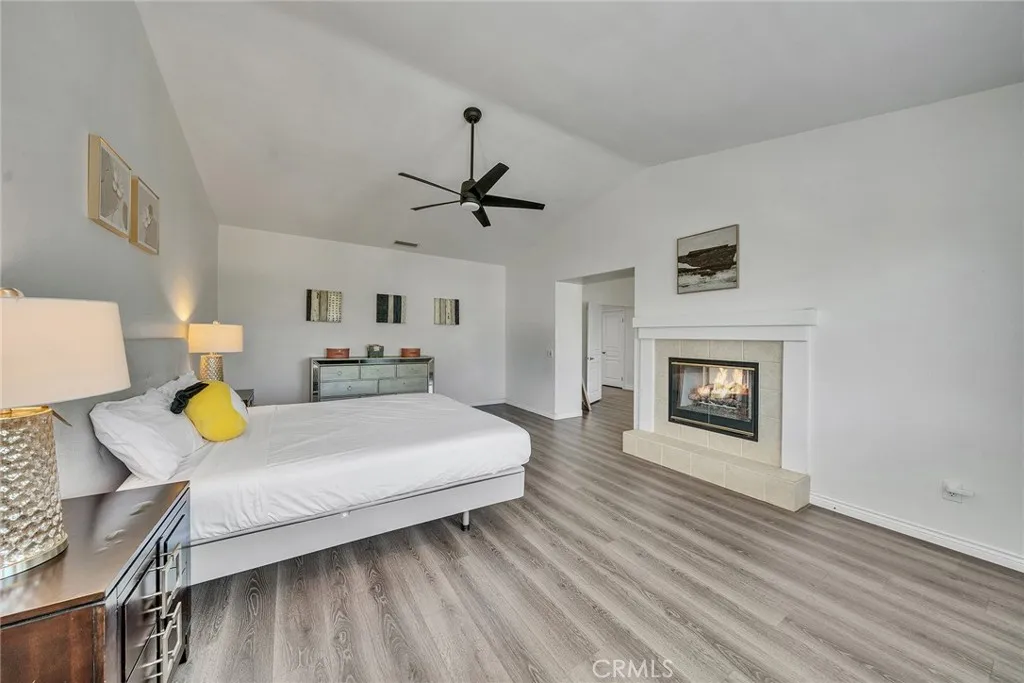 Welcome to this charming contemporary home, ideally positioned on a generous lot with sweeping views of the San Gabriel Mountains, Angeles National Forest, and Mt. Baldy. A pair of double entry doors framed by stacked stone creates a striking first impression and sets the tone for the quality found throughout. Inside, an elegant foyer opens to a dramatic Great Room with soaring sloped ceilings, a warm fireplace, and seamless flow into the spacious open-concept gourmet kitchen. Designed for both everyday living and entertaining, the kitchen showcases a high-BTU stainless steel gas range, abundant cabinetry, and a stunning one-piece stone island accented by custom millwork. The main level also offers exceptional versatility, featuring a dedicated home office or den, a secondary bedroom, two bathrooms, a laundry room, and a deep three-car garage. Upstairs, the private primary suite serves as a true retreat, complete with a double-sided gas fireplace, soaking tub, dual vanities, and a walk-in closet. Three additional hardwood-floored bedrooms are located across the hall, including a boutique-style bedroom created by combining two original rooms. Step outside to an oversized backyard patio ideal for entertaining, barbecuing, or simply relaxing. Stunning outdoor upgrades include a water feature, artificial grass, and a cozy built-in seating area.