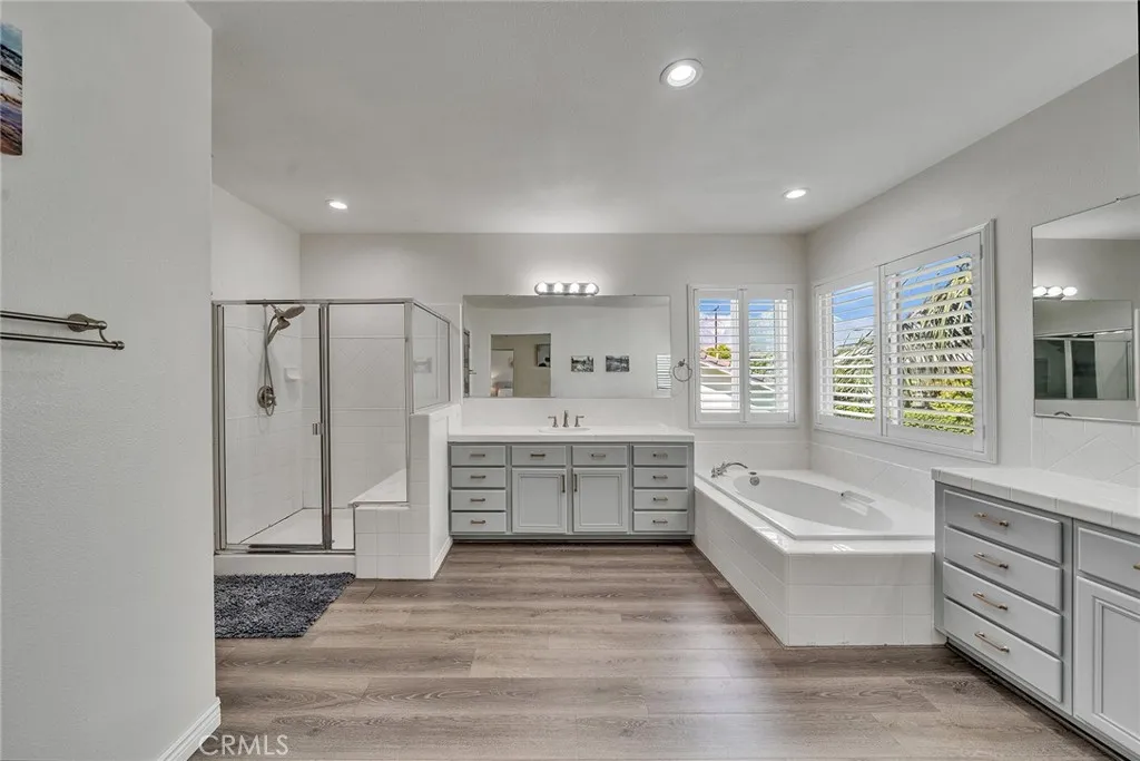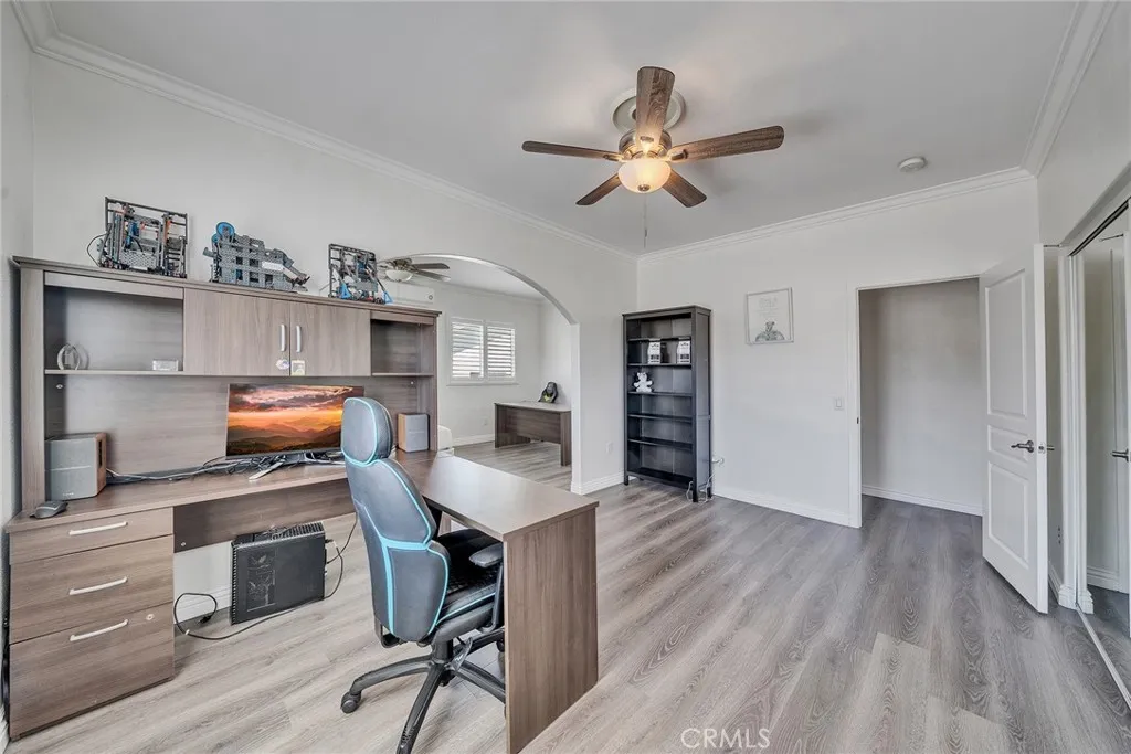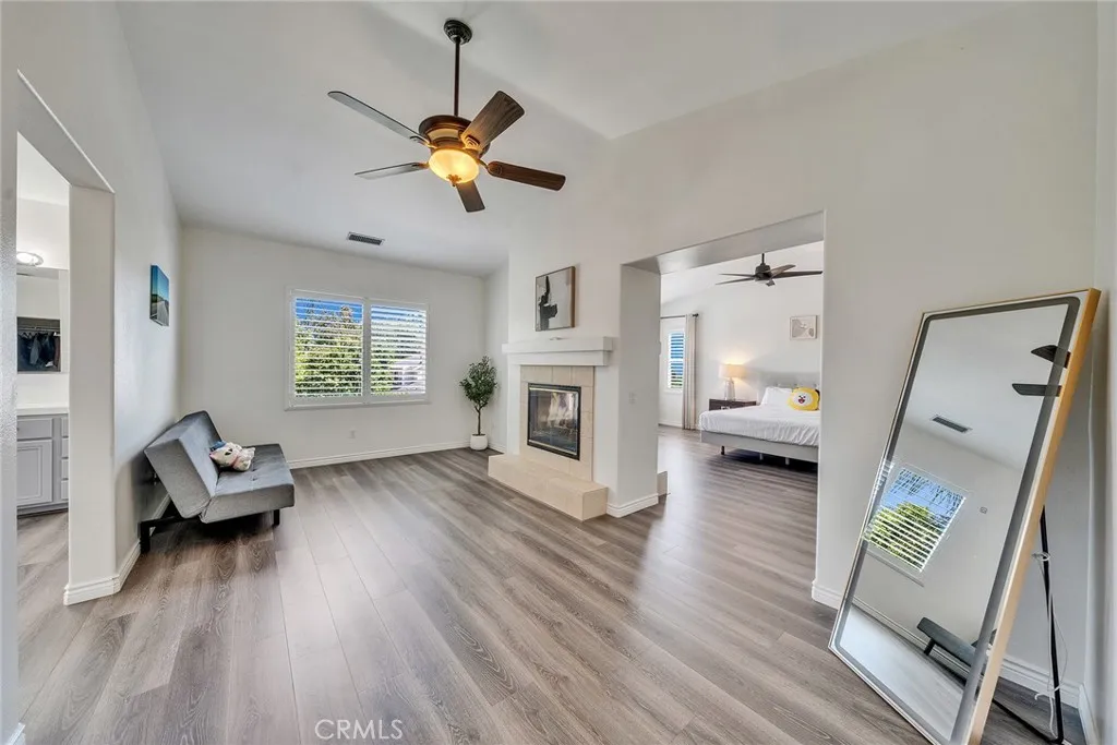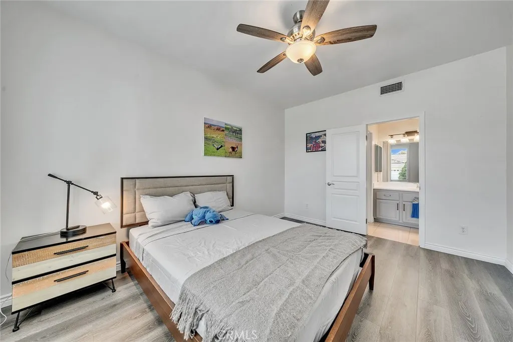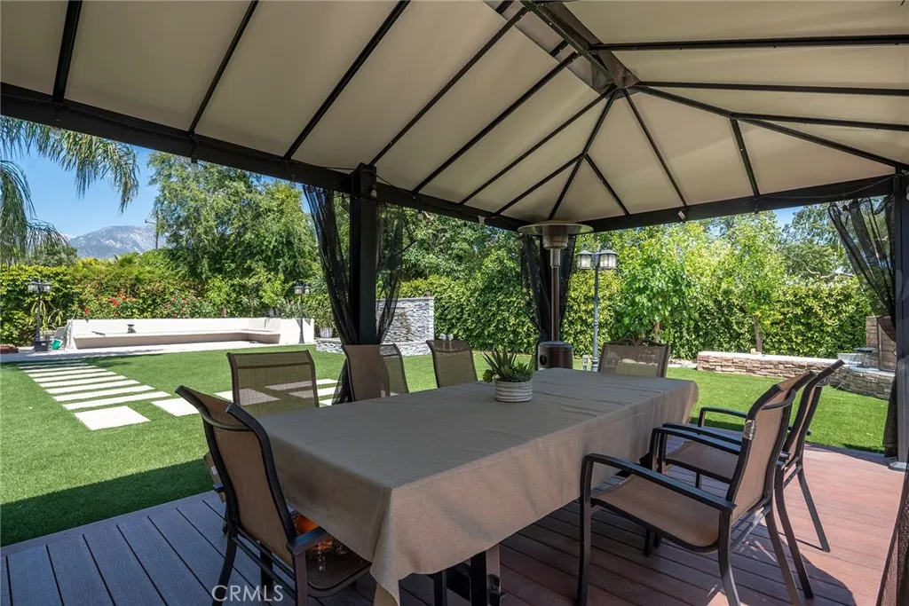 Welcome to this charming contemporary home, ideally positioned on a generous lot with sweeping views of the San Gabriel Mountains, Angeles National Forest, and Mt. Baldy. A pair of double entry doors framed by stacked stone creates a striking first impression and sets the tone for the quality found throughout. Inside, an elegant foyer opens to a dramatic Great Room with soaring sloped ceilings, a warm fireplace, and seamless flow into the spacious open-concept gourmet kitchen. Designed for both everyday living and entertaining, the kitchen showcases a high-BTU stainless steel gas range, abundant cabinetry, and a stunning one-piece stone island accented by custom millwork. The main level also offers exceptional versatility, featuring a dedicated home office or den, a secondary bedroom, two bathrooms, a laundry room, and a deep three-car garage. Upstairs, the private primary suite serves as a true retreat, complete with a double-sided gas fireplace, soaking tub, dual vanities, and a walk-in closet. Three additional hardwood-floored bedrooms are located across the hall, including a boutique-style bedroom created by combining two original rooms. Step outside to an oversized backyard patio ideal for entertaining, barbecuing, or simply relaxing. Stunning outdoor upgrades include a water feature, artificial grass, and a cozy built-in seating area.