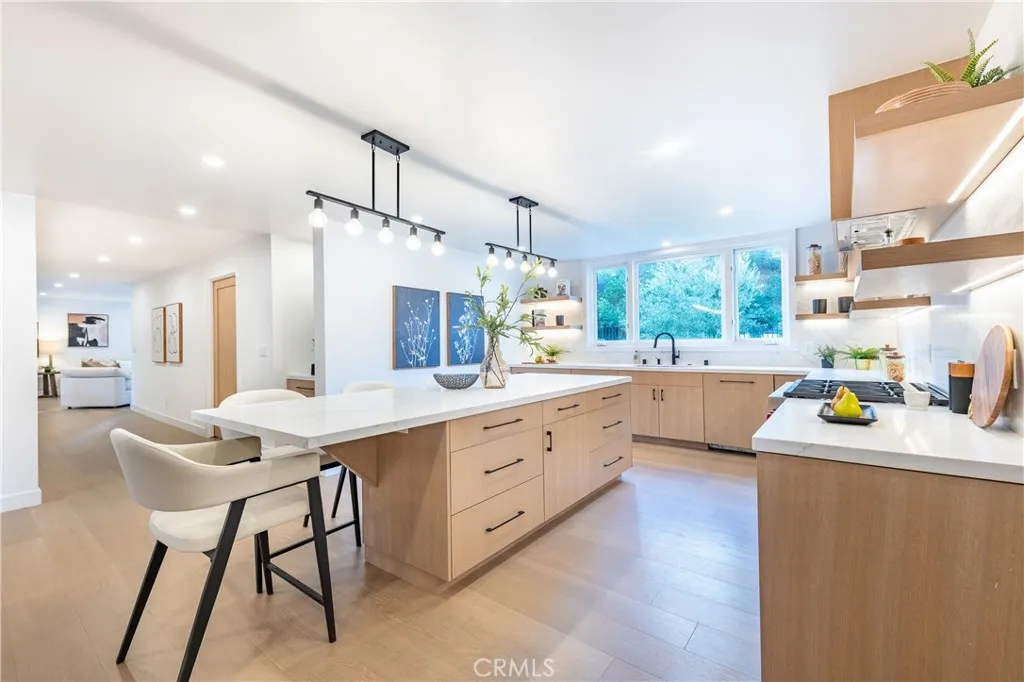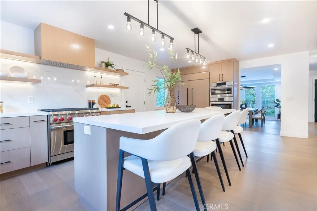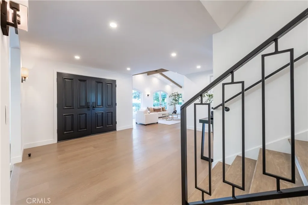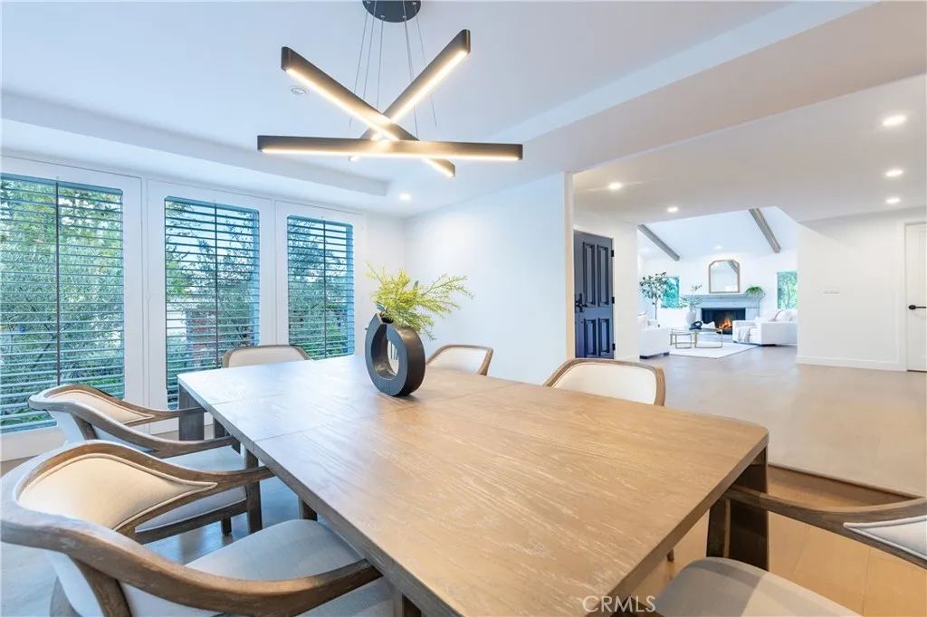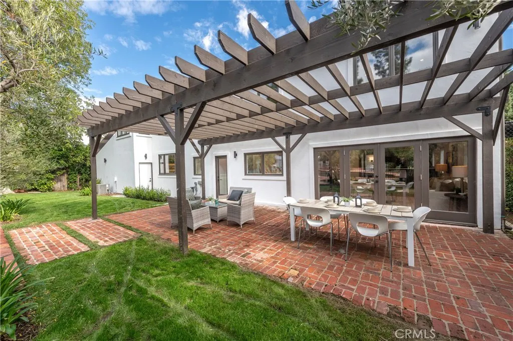 Set on nearly half an acre, this completely redesigned Spanish Transitional estate blends timeless architecture with modern luxury living. The grounds set the tone of the residence as a true resort-style sanctuary designed for year-round California living. A championship-style pickleball court anchors the recreational amenities while a gated pool and spa shimmer at the center of the landscape. Expansive brick-lined terraces, a pergola-covered lounge area, and generous stretches of manicured lawn create distinct zones for entertaining, unwinding, and gathering under open skies. This is outdoor living elevated into a private estate experience. Inside, soaring beamed and cathedral ceilings, wide-plank wood flooring, and bespoke architectural detailing set a tone of understated sophistication. Walls of glass and multiple sets of French doors dissolve the boundary between indoors and out, flooding the home with natural light and constant connection to the resort-like exterior. The chefs kitchen is a statement in both form and function, anchored by a generous island with seating, stone surfaces, soft-close cabinetry, and premium appliances, including a 6-burner Wolf range and ovens. The adjoining family room is designed for elevated entertaining with a custom wet bar and integrated wine fridge, while the formal dining room offers a refined setting framed by designer lighting and tranquil views. Five en-suite bedrooms provide exceptional privacy and scale, including a spectacular primary suite that rivals a five-star resort. A fireplace, dual French doors to a private balcony, and
