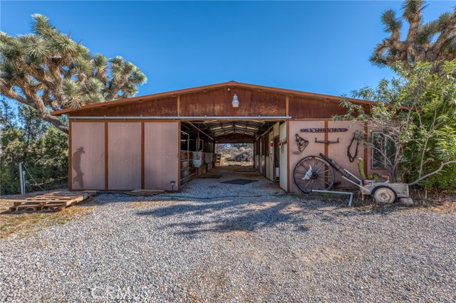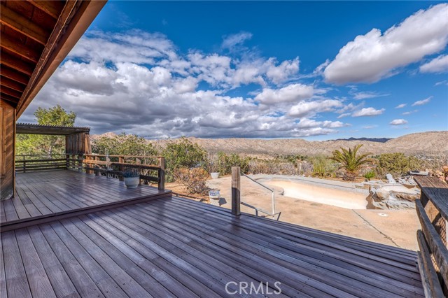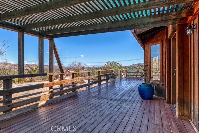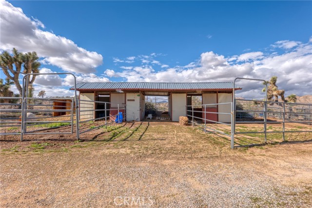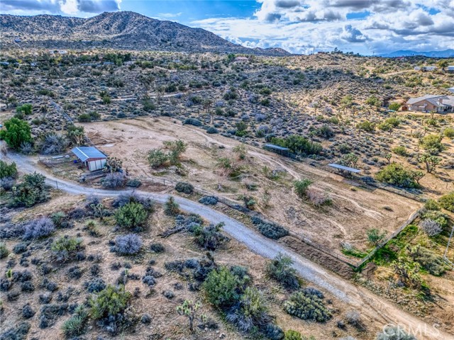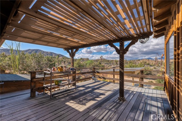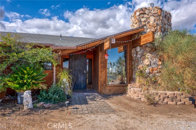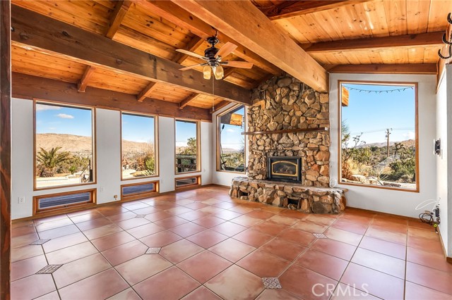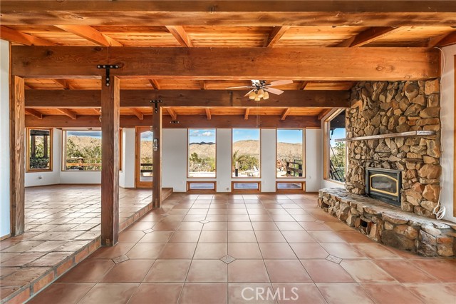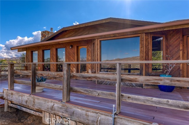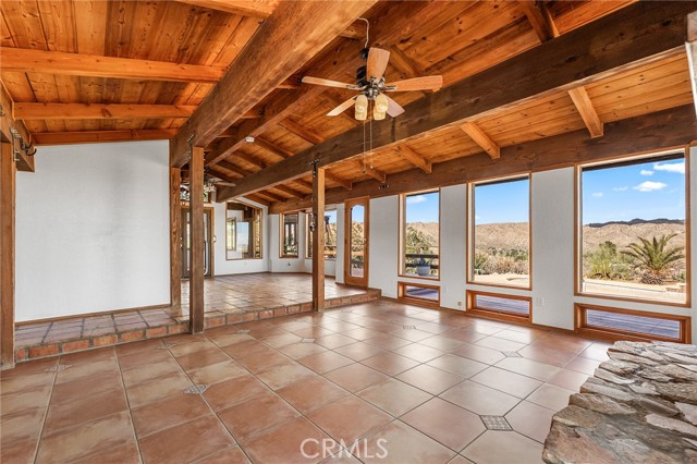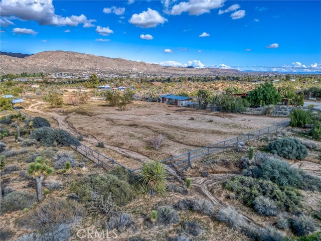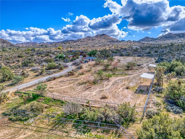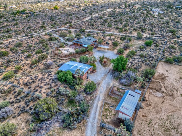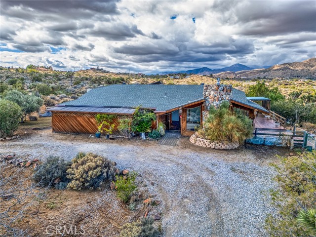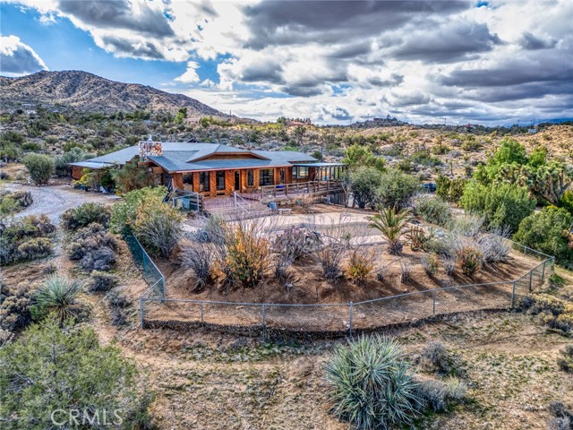A Desert Artist’s Retreat on 11.69 Acres of Pure Inspiration. Discover one of the most unique and captivating properties in the entire Morongo Basin, a stunning wood-constructed desert retreat set on 11.69 acres of spectacular land with panoramic mountain and desert views in every direction. Properties with this level of land, privacy, and craftsmanship are exceptionally rare. Step inside and immediately feel the warmth of the exposed wood-beam construction, a hallmark feature that brings character, authenticity, and artistry to every room. Expansive windows fill the home with natural light and frame the ever-changing desert scenery, creating a truly inspiring atmosphere. The spacious kitchen opens seamlessly to the dining and living areas, making it ideal for gatherings or quiet evenings at home. The primary bedroom continues the wood-beam theme with rich ceilings and a custom en-suite bathroom featuring a one of a kind shower and bath design. Every space feels intentional, inviting, and unlike anything else on the market. Outside, multiple wood decks and patios provide perfect spots to soak in the desert sun, entertain guests, or simply unwind as the sky turns brilliant shades of pink and orange. A pool and spa, currently drained and unused for years, await your vision to restore them into an oasis once again. The expansive acreage stretches from Mountain View to the next street south and includes multiple barns and arenas, offering endless possibilities, animals, car storage, creative spaces, or whatever lifestyle you envision. The main barn is especially versatile, ideal for livestock or a generous garage/workshop setup. Additional features include owned solar, a private water well, solar panels thoughtfully installed on a separate carport structure, and full fencing with electric gates for added security and privacy. If you value style, craftsmanship, and true desert uniqueness, this extraordinary property must be seen in person. With its rare acreage, wood construction, sweeping views, and endless opportunity, this one stands in a category all its own.